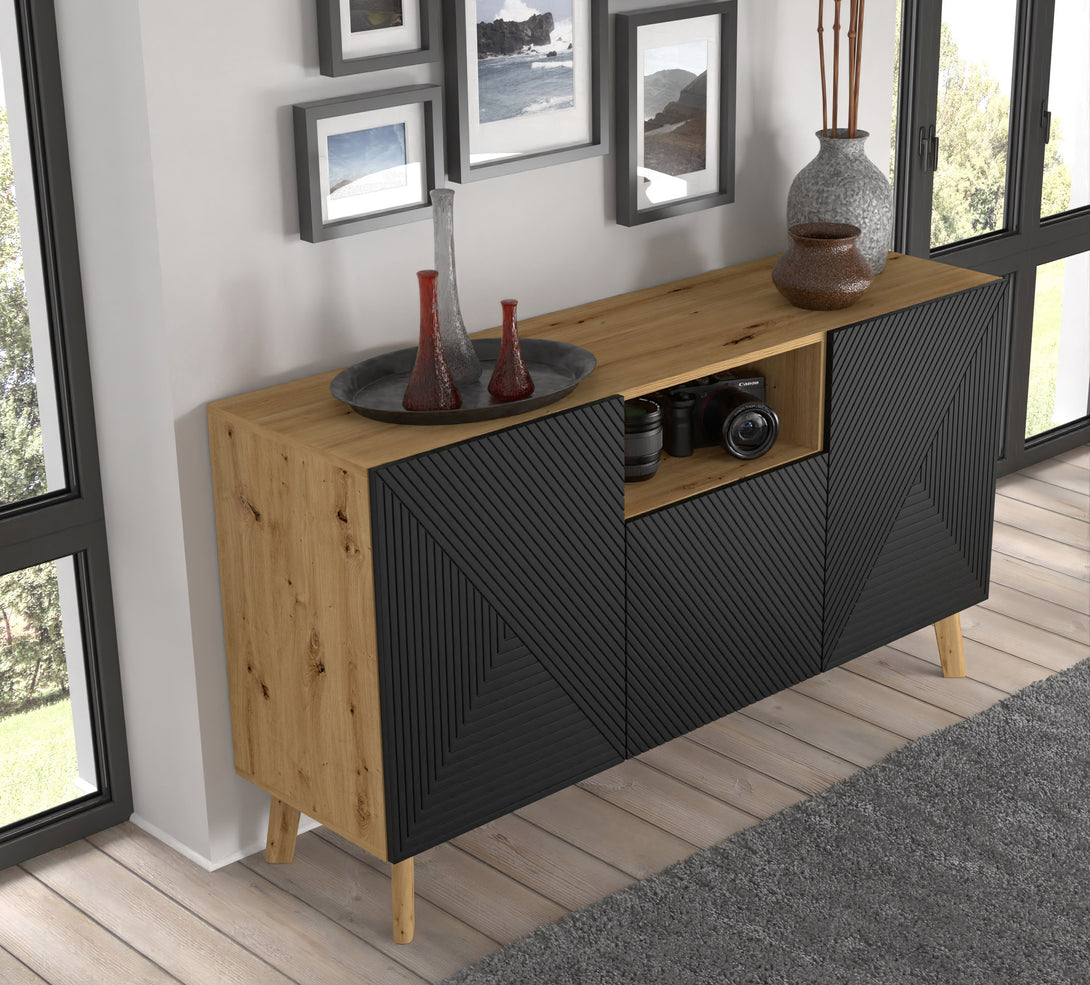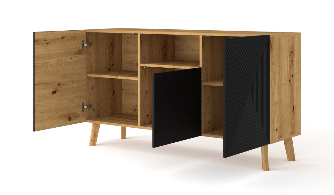 Die LUXI Kommode überzeugt mit einer modernen Kombination aus Artisan-Eiche und mattem Schwarz und passt perfekt in jedes stilbewusste Wohnkonzept. Das Möbelstück bietet mit drei geschlossenen Schränken und einem offenen Fach großzügigen Stauraum für Alltagsgegenstände, Elektronik oder Dekoration. Die schrägen Holzfüße verleihen dem Design einen besonderen Charakter, während die grifflosen Fronten mit Push-to-Open-System eine elegante und praktische Lösung bieten.