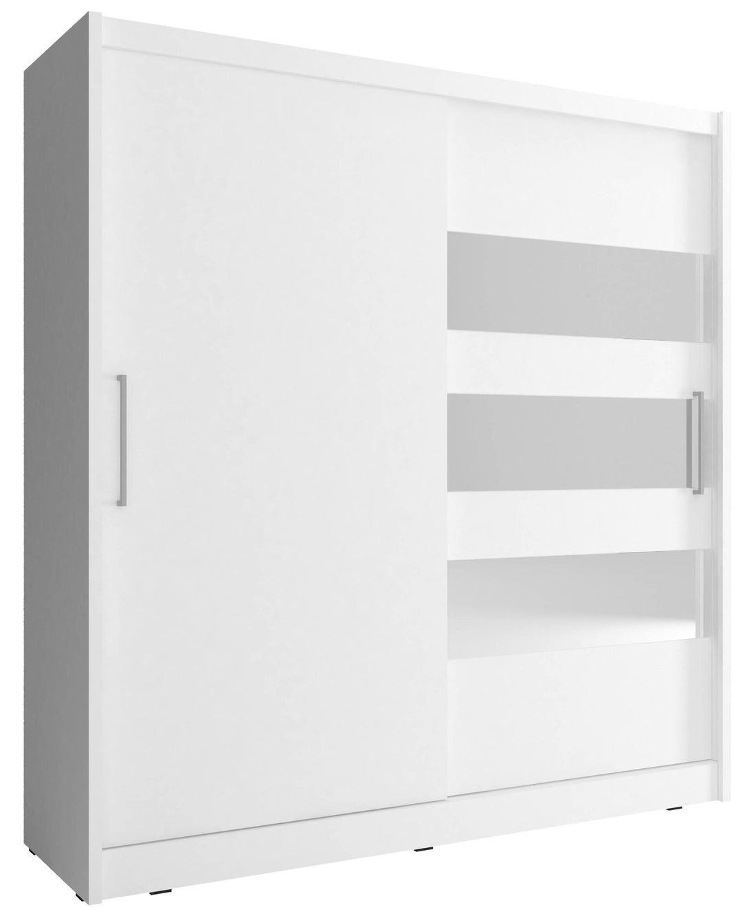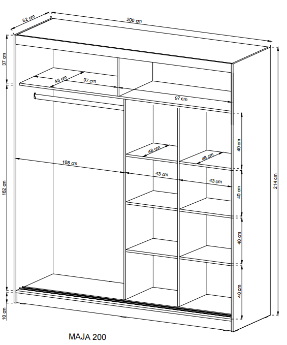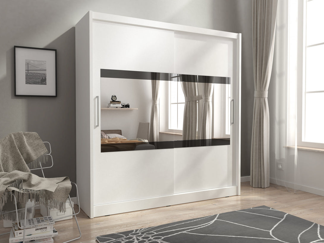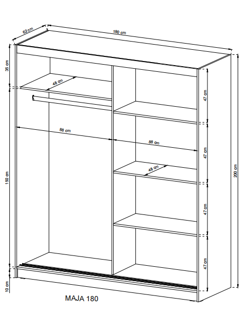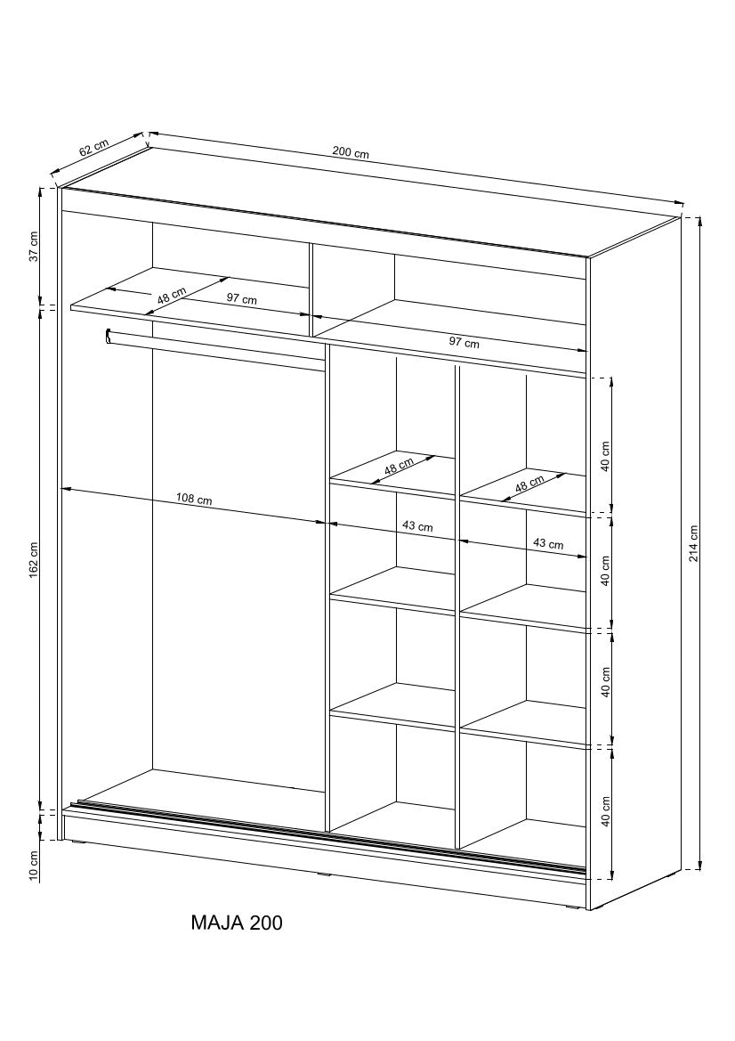 Der MAJA I Kleiderschrank vereint modernes Design mit funktionalem Stauraum. Die elegante Spiegelfront und die grifflosen Türen sorgen für ein klares, minimalistisches Erscheinungsbild, das sich perfekt in jedes Schlafzimmer integriert. Die hochwertige Verarbeitung aus MDF- und laminierten Spanplatten gewährleistet Stabilität und Langlebigkeit für den täglichen Gebrauch. Mit großzügigem Innenraum, praktischer Aufteilung und leichtgängigen Schwebetüren bietet dieser Schrank die ideale Lösung für stilvolle Ordnung im Zuhause.