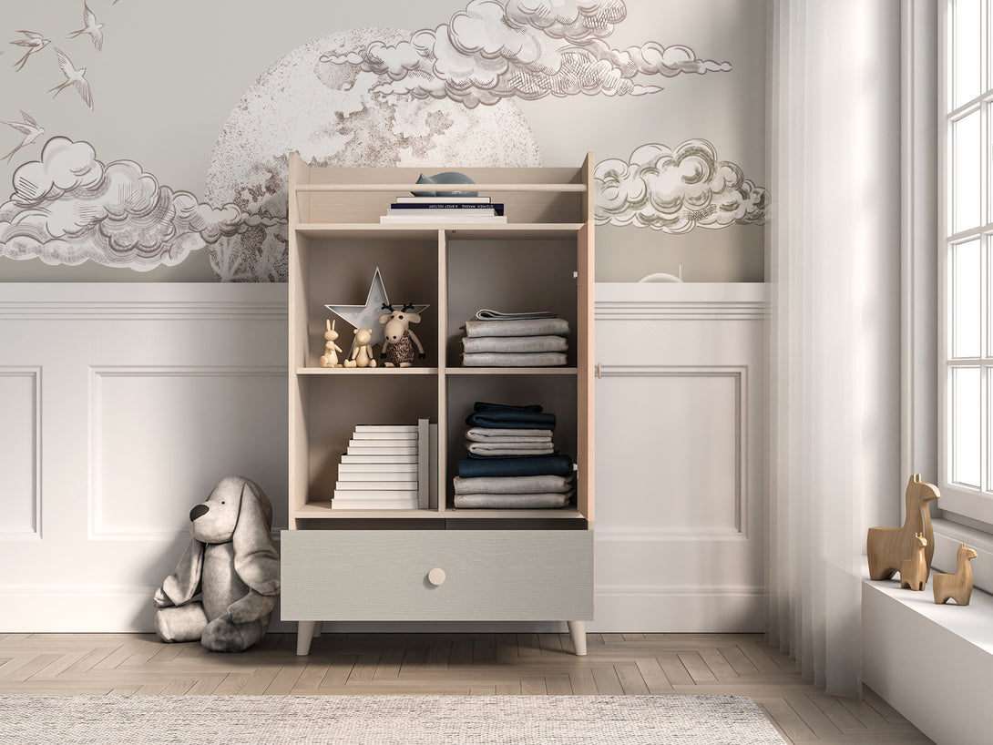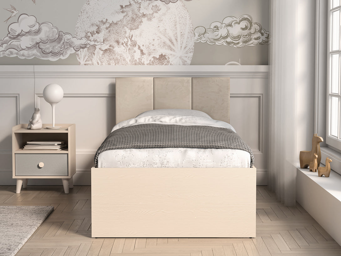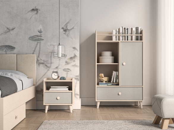 Das MEVEL Schlafzimmer-Set vereint modernes Design und höchste Funktionalität für ein stilvolles Schlafambiente. Die Kommode mit praktischen Vollauszug-Schubladen und erhöhter Tragkraft bietet großzügigen Stauraum und eine elegante Front in Szary Pallad, während die präzise Verarbeitung mit hochwertigen ABS-Kanten und laminierten Oberflächen für Langlebigkeit sorgt.Das komfortable Bett besticht durch einen edlen Kopfteil aus beigem Velours, kombiniert mit Korpus in Piasek Pustyni, und bietet eine solide Konstruktion aus laminierten Platten. Der Nachttisch ergänzt das Set perfekt und überzeugt mit modernem Design und Schublade mit Vollauszug, ebenfalls in Szary Pallad, wodurch ein harmonischer Gesamteindruck entsteht.