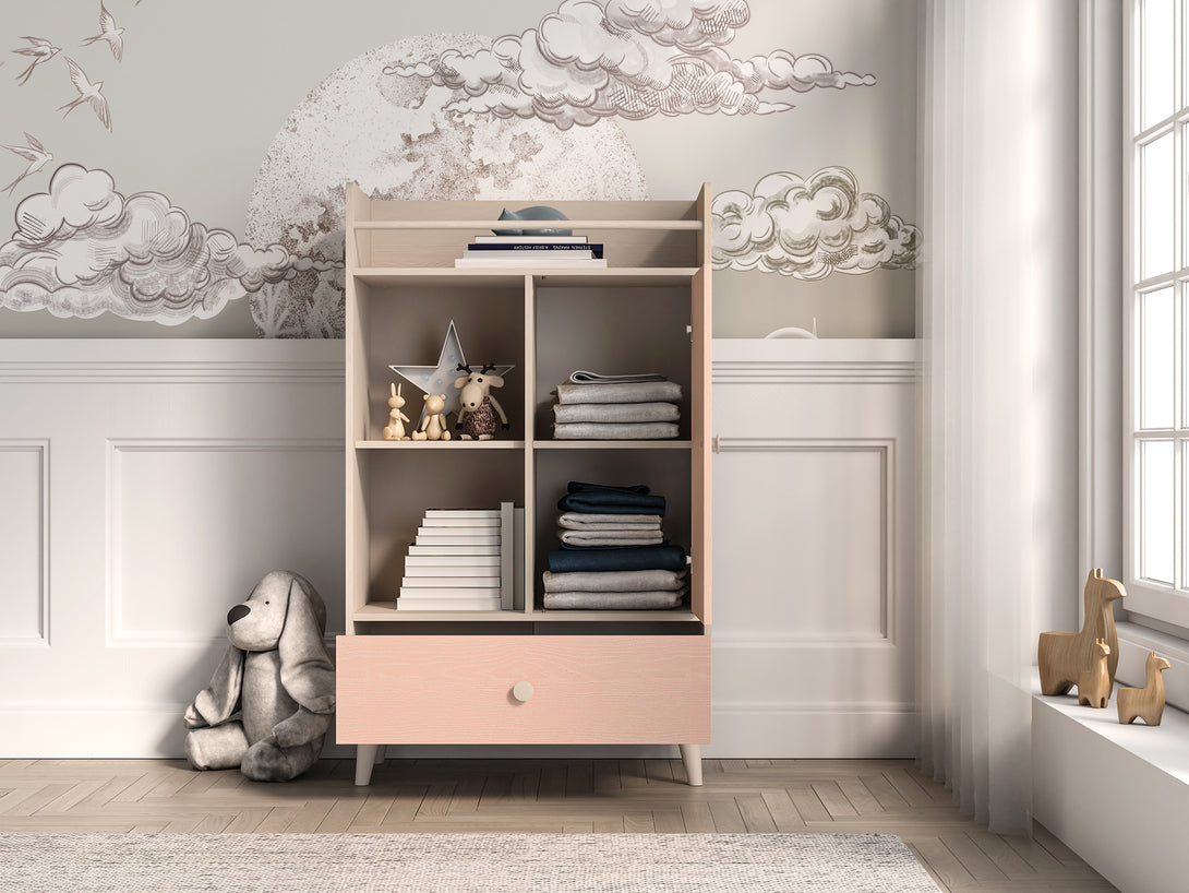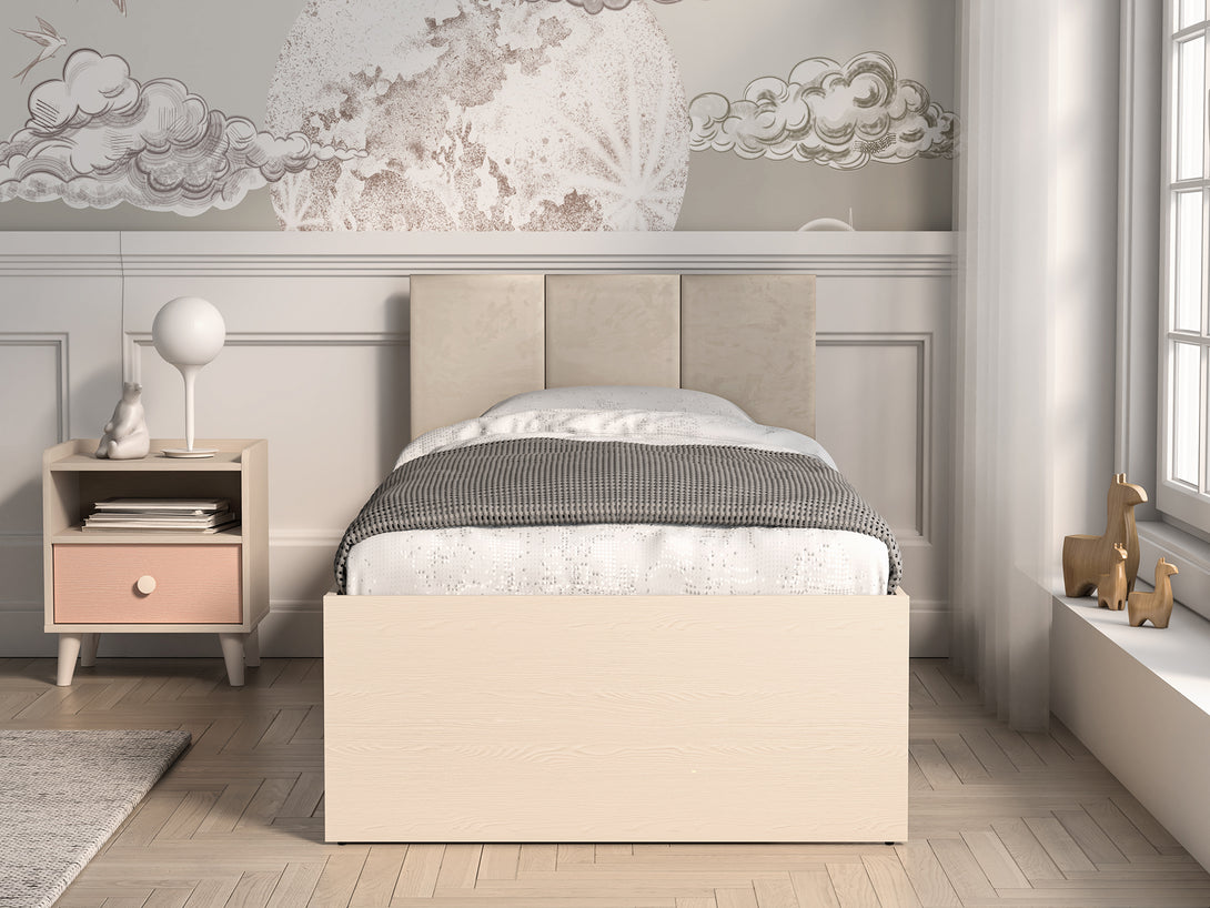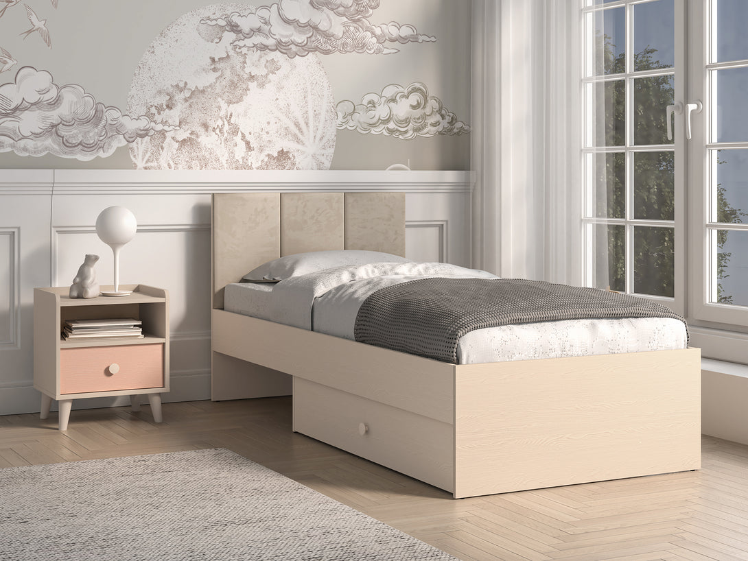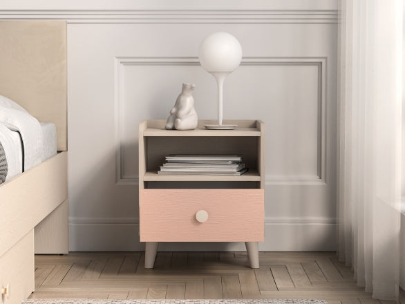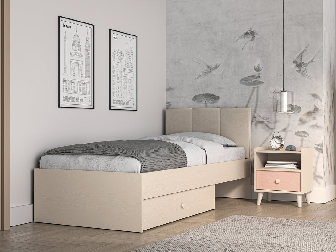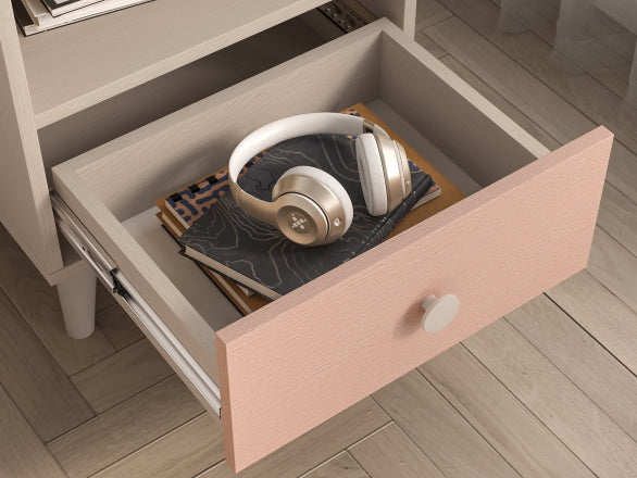 Das MEVEL Schlafzimmer-Set kombiniert modernes Design mit funktionalem Komfort und verleiht jedem Raum eine elegante Note. Die Kommode bietet dank Vollauszug-Schubladen und erhöhter Tragkraft großzügigen Stauraum und präsentiert sich mit einer stilvollen Front in Millenial Pink, während präzise ABS-Kanten und laminierte Oberflächen für eine hochwertige Optik sorgen.Das komfortable Bett überzeugt mit einem edlen Kopfteil aus beigem Velours und einem Korpus in Piasek Pustyni, was eine warme und einladende Atmosphäre schafft. Der Nachttisch ergänzt das Set perfekt durch modernes Design und eine praktische Schublade mit Vollauszug, ebenfalls in Millenial Pink, wodurch ein harmonisches Gesamtbild entsteht.