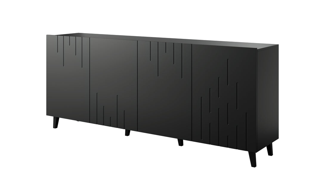 Die MOBY Kommode kombiniert modernes Design mit hoher Funktionalität und großzügigem Stauraum. Die dekorativen Fräsungen in den Fronten und die grifflosen, überlappenden Türen verleihen dem Möbelstück ein minimalistisches und elegantes Erscheinungsbild. Die matte Oberfläche sorgt für eine angenehme Haptik und ist besonders pflegeleicht. Mit vier Türen bietet die Kommode viel Platz zur ordentlichen Aufbewahrung verschiedenster Gegenstände im Wohn- oder Essbereich.