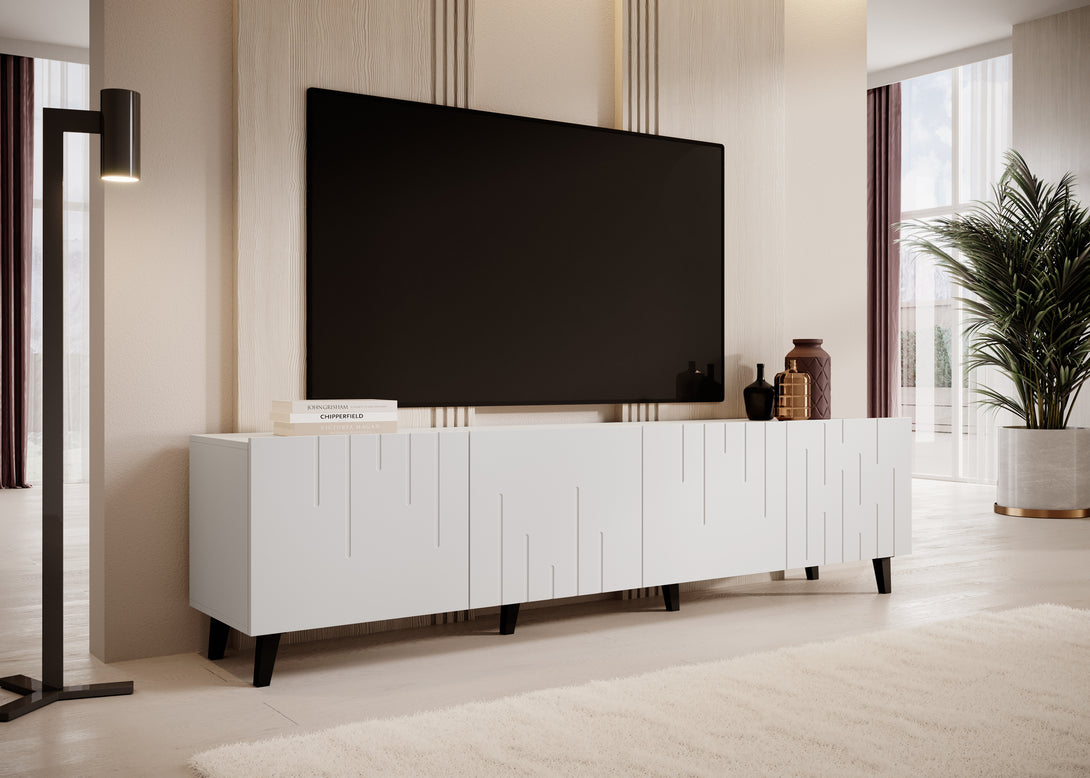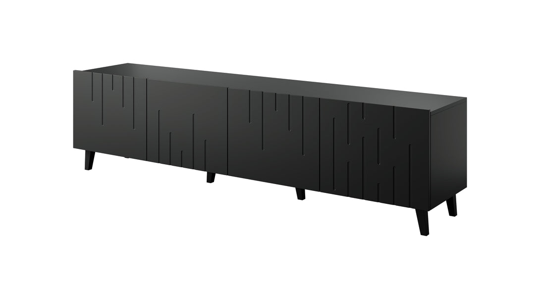 Der MOBY TV-Schrank überzeugt durch seine moderne Optik und praktische Funktionalität. Die sichtbaren Fräsungen in den Fronten verleihen dem Möbelstück ein stilvolles und zeitgemäßes Design. Dank der überlappenden Fronten ist kein Griff erforderlich, was das minimalistische Erscheinungsbild unterstreicht. Die matte Oberfläche sorgt für eine angenehme Haptik und einfache Pflege. Mit seinen vier geräumigen Fächern bietet der Schrank viel Stauraum für TV-Zubehör und Alltagsgegenstände.
