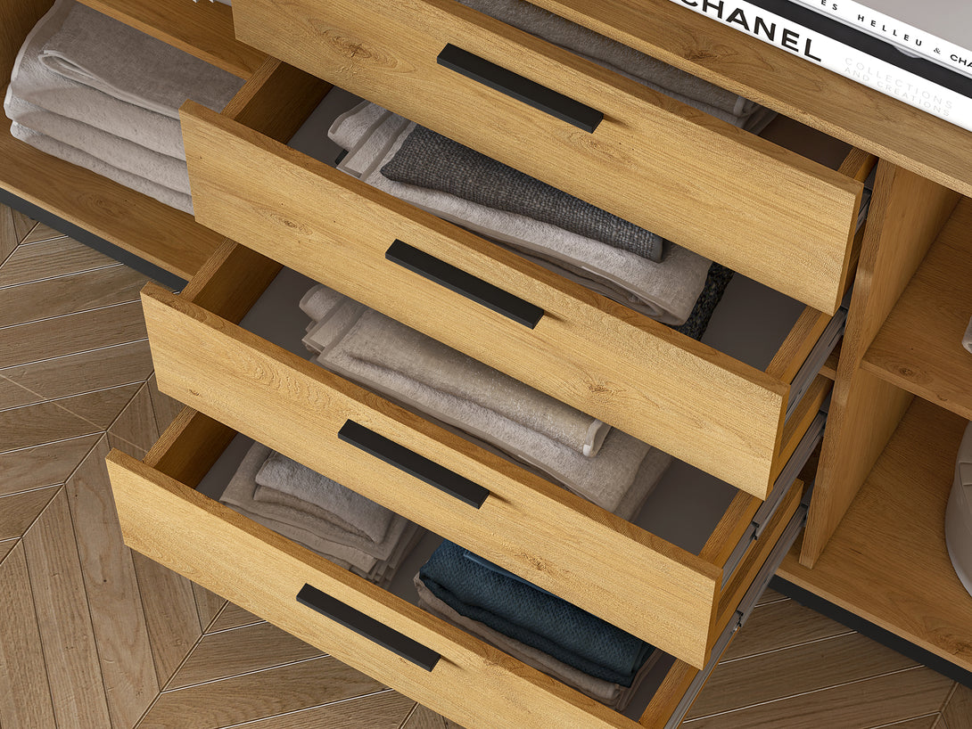 Die hochwertigen Materialien wie laminiertes Holz mit ABS-Kanten sowie der leise Schließmechanismus sorgen für Langlebigkeit und angenehme Handhabung im Alltag. Die erhöhte Tragfähigkeit der Schubladen und der Vollauszug ermöglichen zudem eine komfortable Nutzung und Organisation.