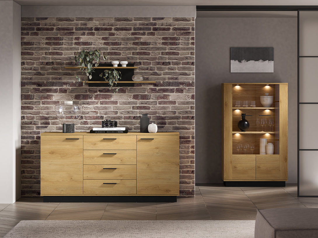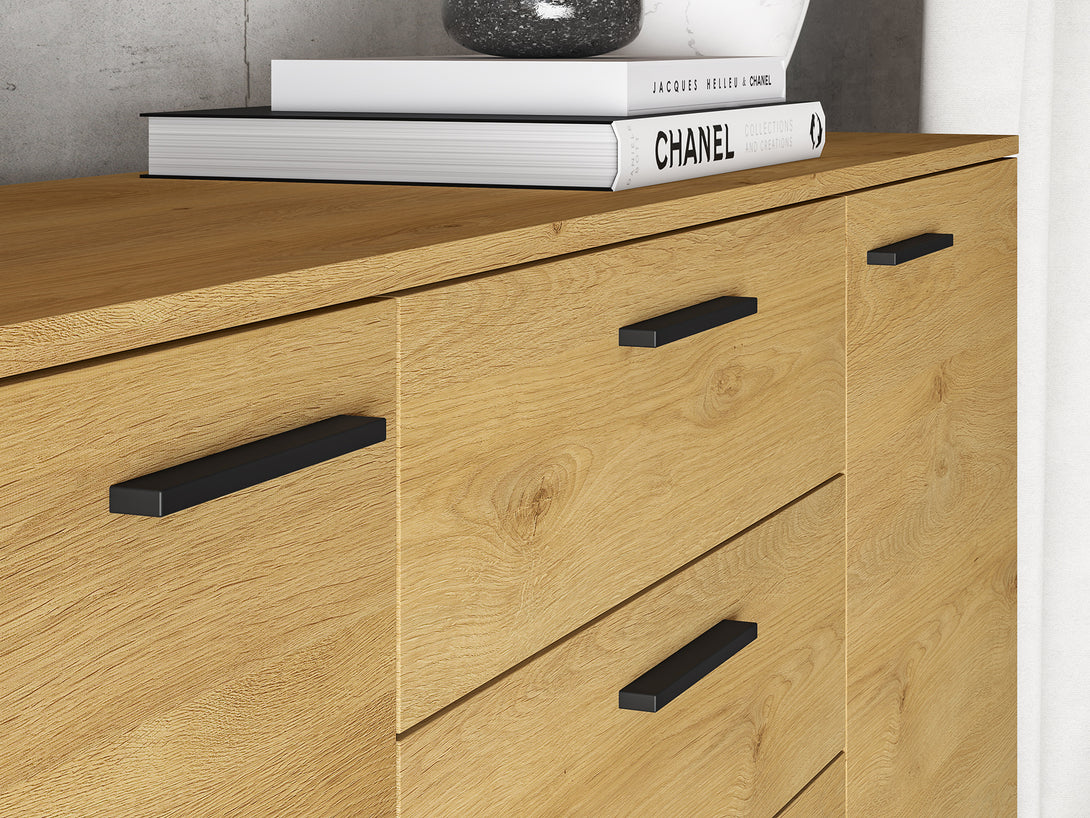 Die Kommode MODESTO 04 vereint funktionales Design mit einer stilvollen Ausführung in Holzoptik, ergänzt durch ein schwarzes Sockelelement. Mit ihren großzügigen Schubladen und Türen bietet sie optimalen Stauraum für Ihr Zuhause – ideal für Wohnzimmer, Schlafzimmer oder Flur.