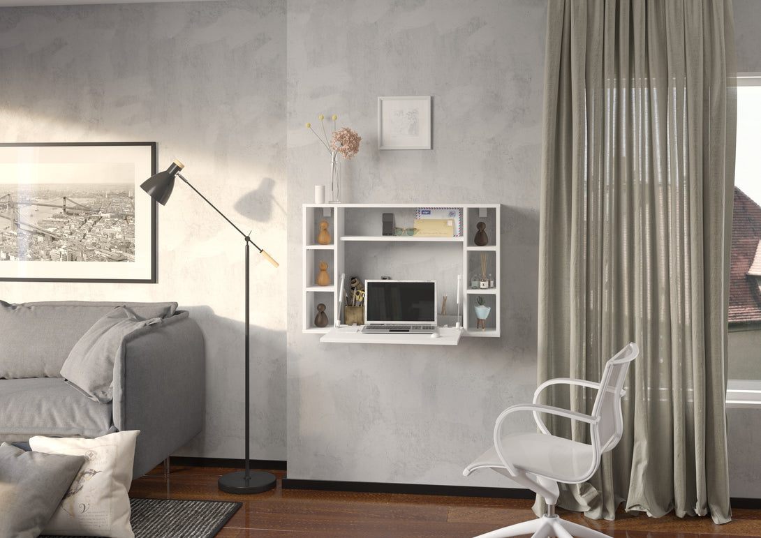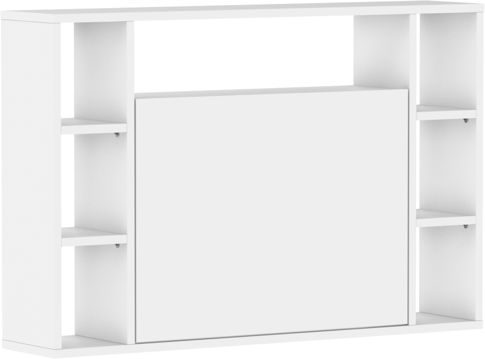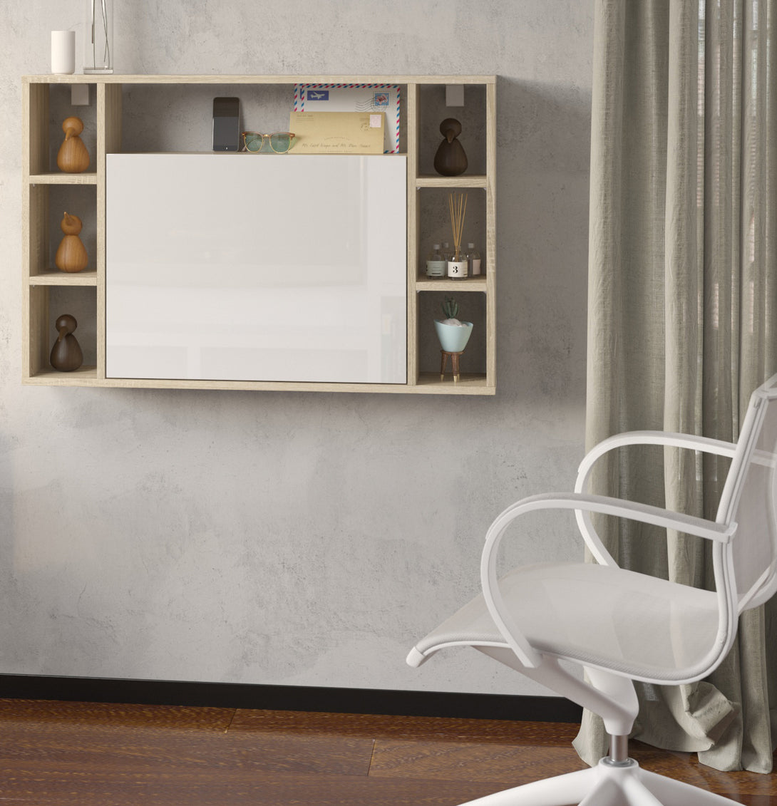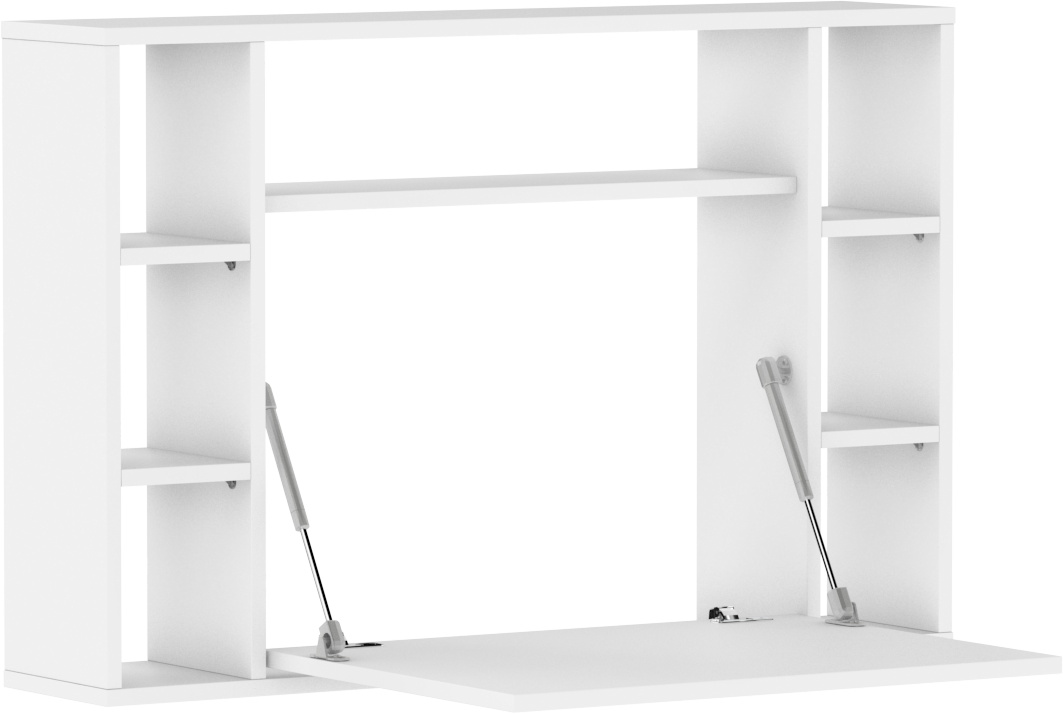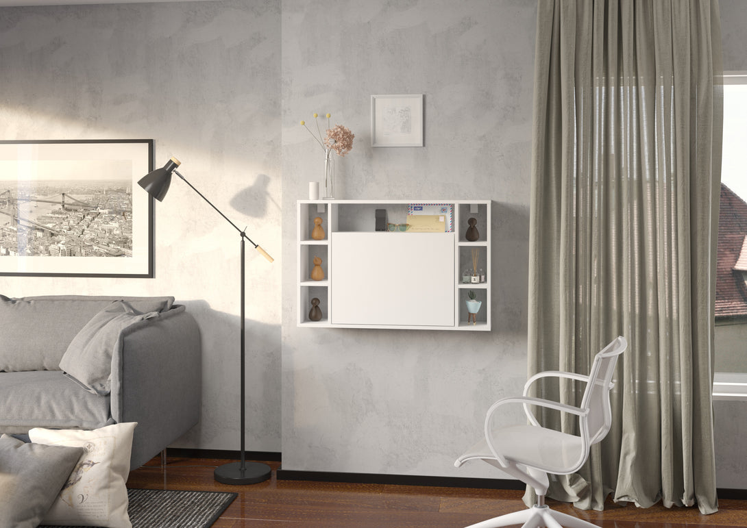 Dank gasgefederter Teleskope lässt sich die Klappfläche mühelos öffnen und schließen. Die Möbelkonstruktion wird direkt an der Wand befestigt und trägt bis zu 60 kg. Das weiße matte Finish sorgt für ein modernes Erscheinungsbild und fügt sich harmonisch in jede Einrichtung.