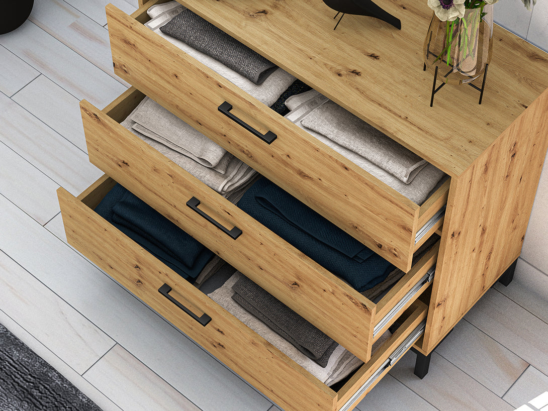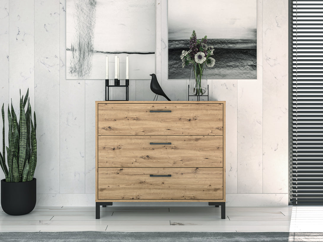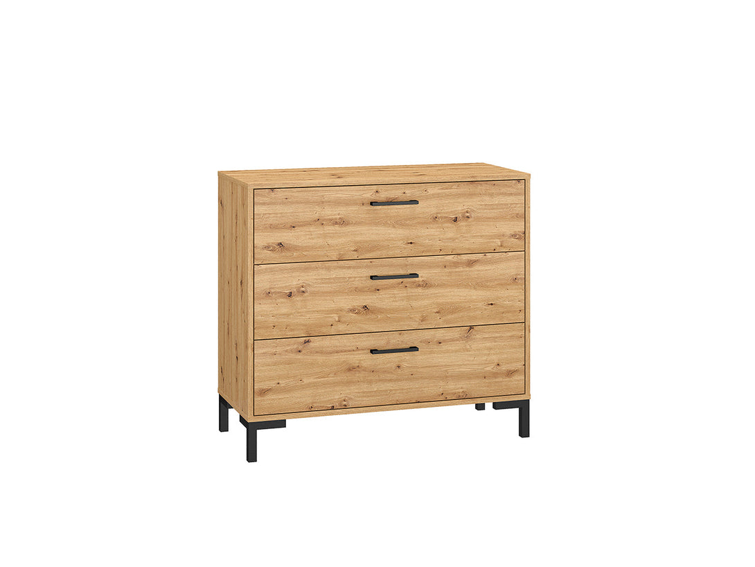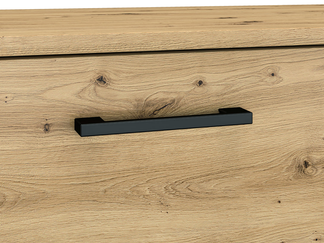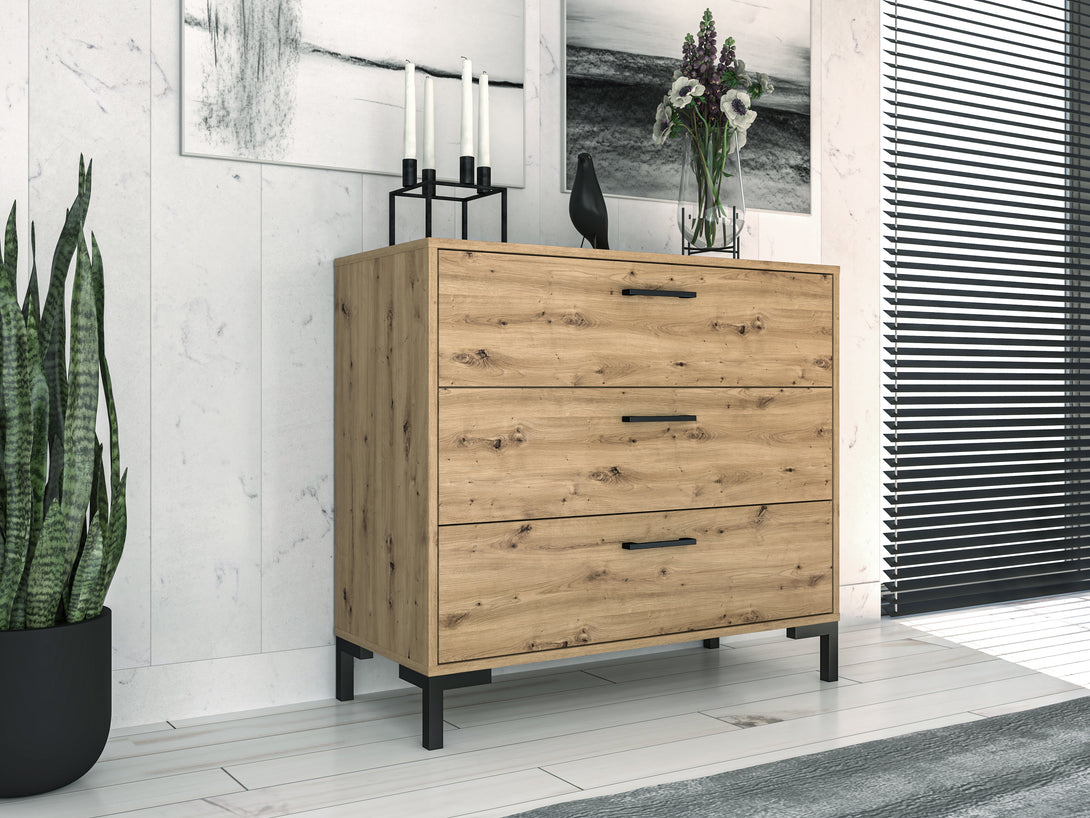 Die NEVIO 09 Kommode vereint modernes Design mit durchdachter Funktionalität und bietet eine praktische Lösung für die stilvolle Aufbewahrung im Wohn- oder Schlafzimmer. Der Korpus und die Front sind aus hochwertig laminierter Spanplatte im Dekor Dąb Artisan gefertigt und mit ABS-Kanten versehen, was für eine hohe Widerstandsfähigkeit im Alltag sorgt. Die kompakten Maße machen das Möbelstück besonders platzsparend, während das natürliche Holzdekor eine warme Wohnatmosphäre schafft.