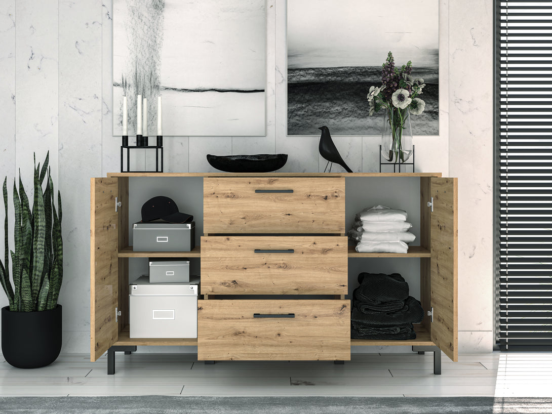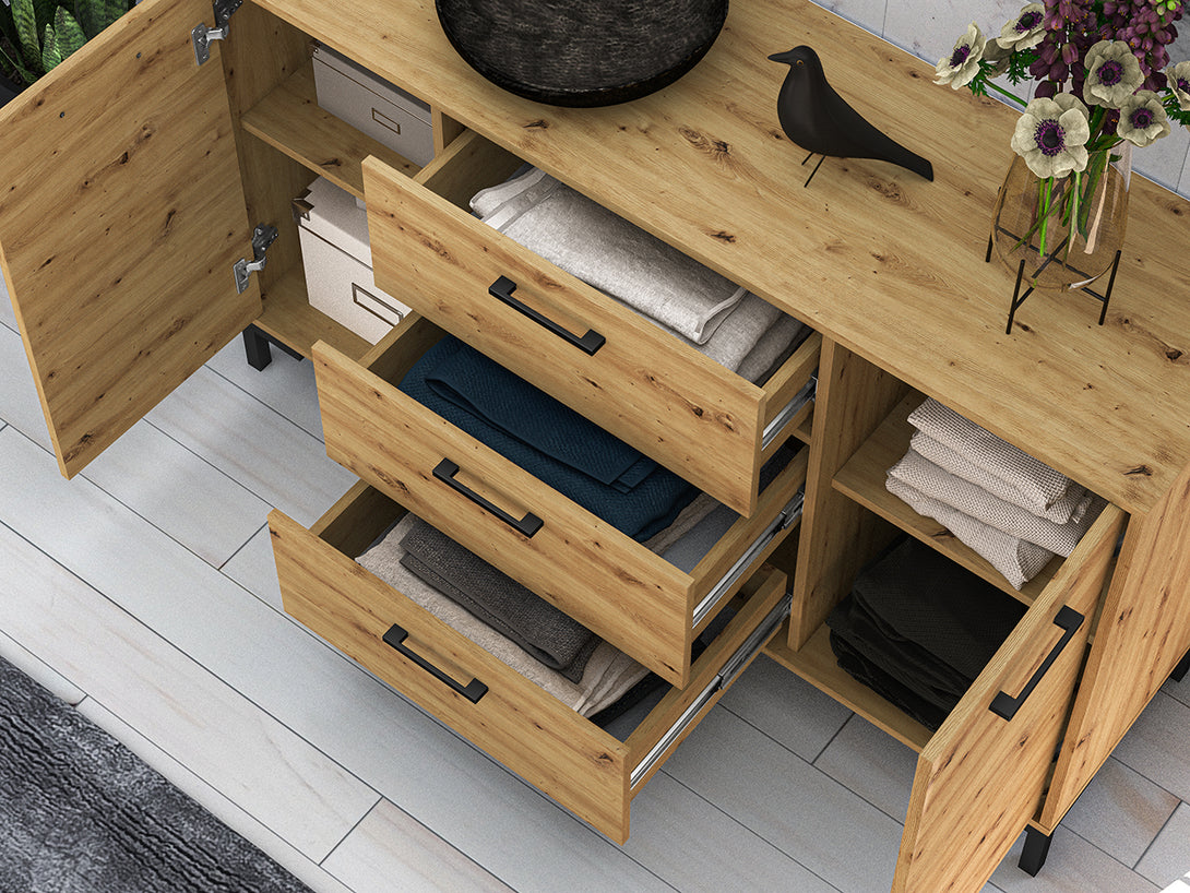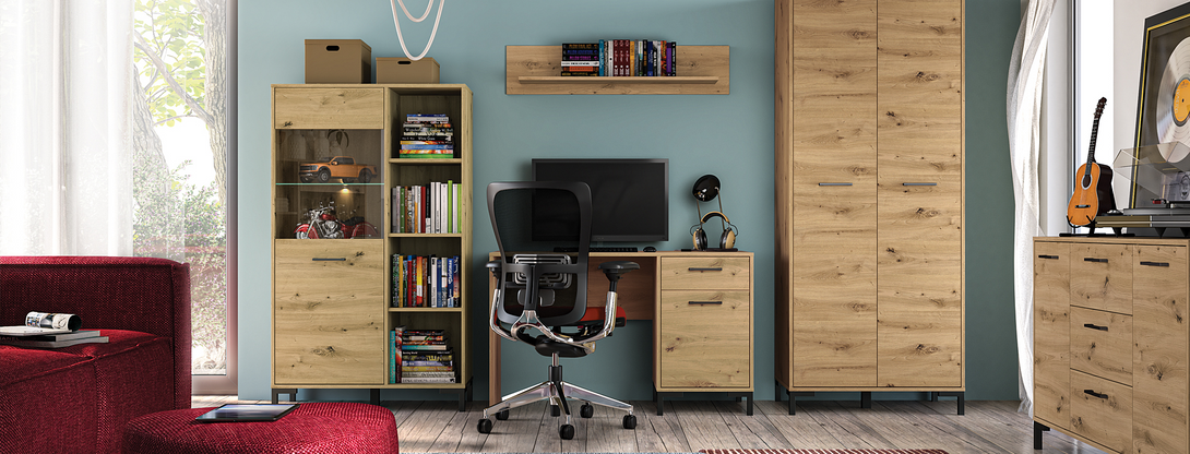 Jedes Möbelstück erfüllt einen durchdachten Zweck: von der funktionalen Kommode über das praktische Wandregal bis hin zum stilvollen Schreibtisch – alles ist harmonisch aufeinander abgestimmt. Für ein einheitliches, hochwertiges Wohnambiente mit Charakter.