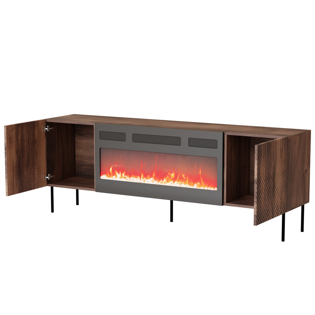 Mit einer Breite von 190,5 cm bietet das Möbelstück nicht nur ausreichend Stauraum hinter zwei Türen und einer Klappe, sondern auch ein integriertes Elektrokamin-Modul, das für stimmungsvolles Licht und ein gemütliches Ambiente sorgt – perfekt für stilvolle Wohnräume.