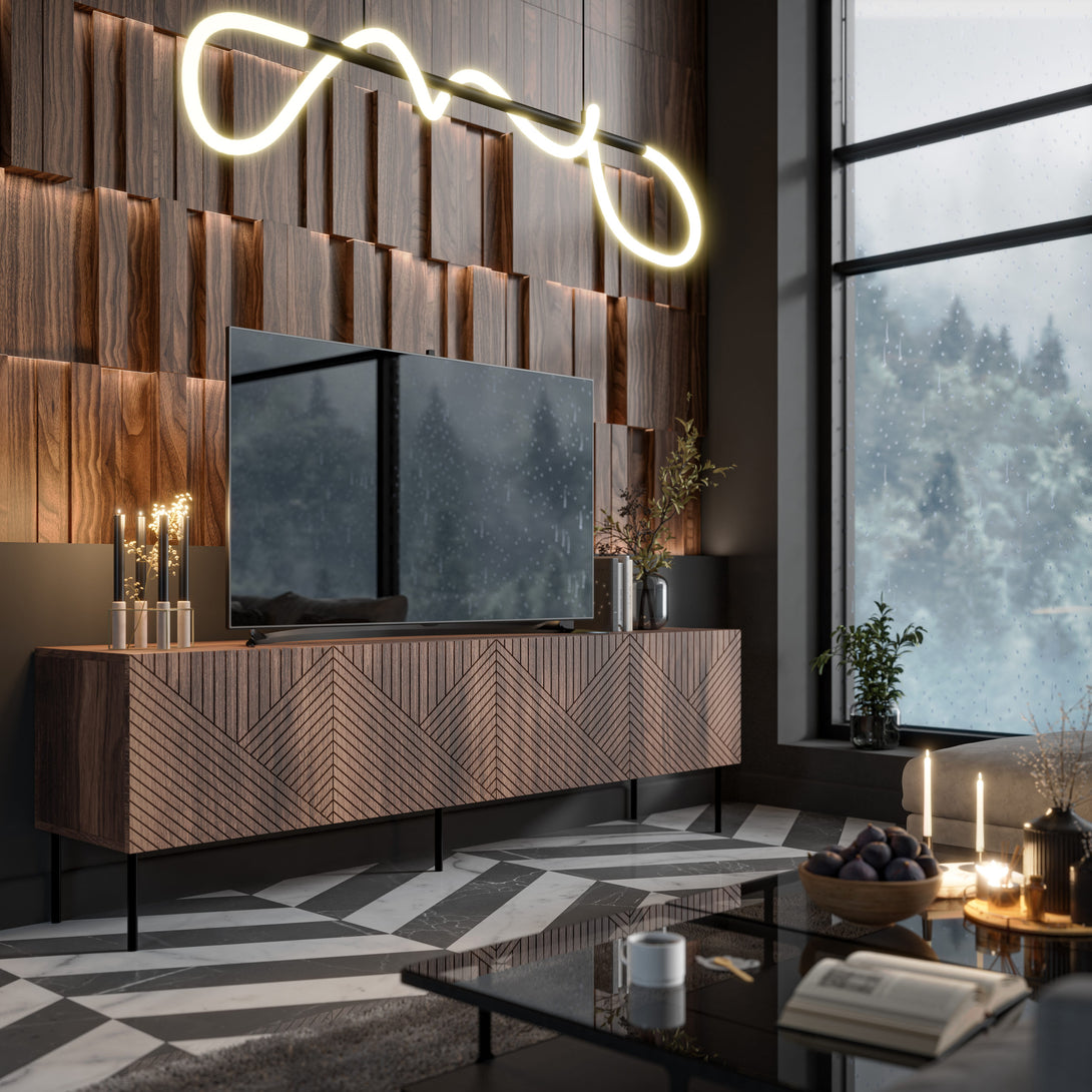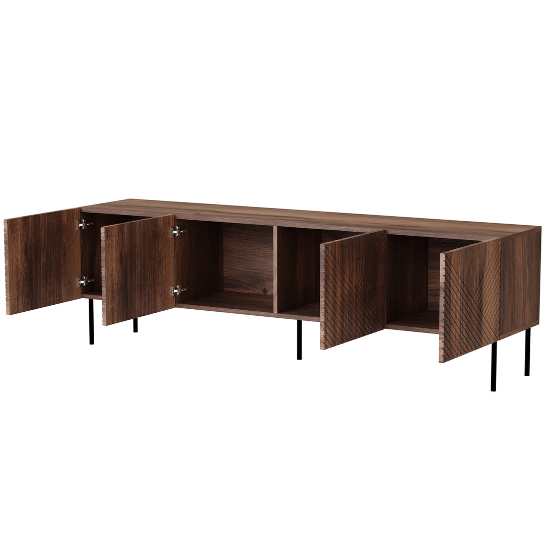 Mit einer Breite von 190,5 cm bietet das Lowboard ausreichend Platz für große TV-Geräte und zusätzlichen Stauraum hinter vier grifflosen Türen. Die stabile Konstruktion aus laminierten Spanplatten und MDF gewährleistet Langlebigkeit und Stabilität im täglichen Gebrauch. Der TV-Schrank eignet sich ideal für moderne Wohnzimmer mit einem Hang zum stilvollen Minimalismus.