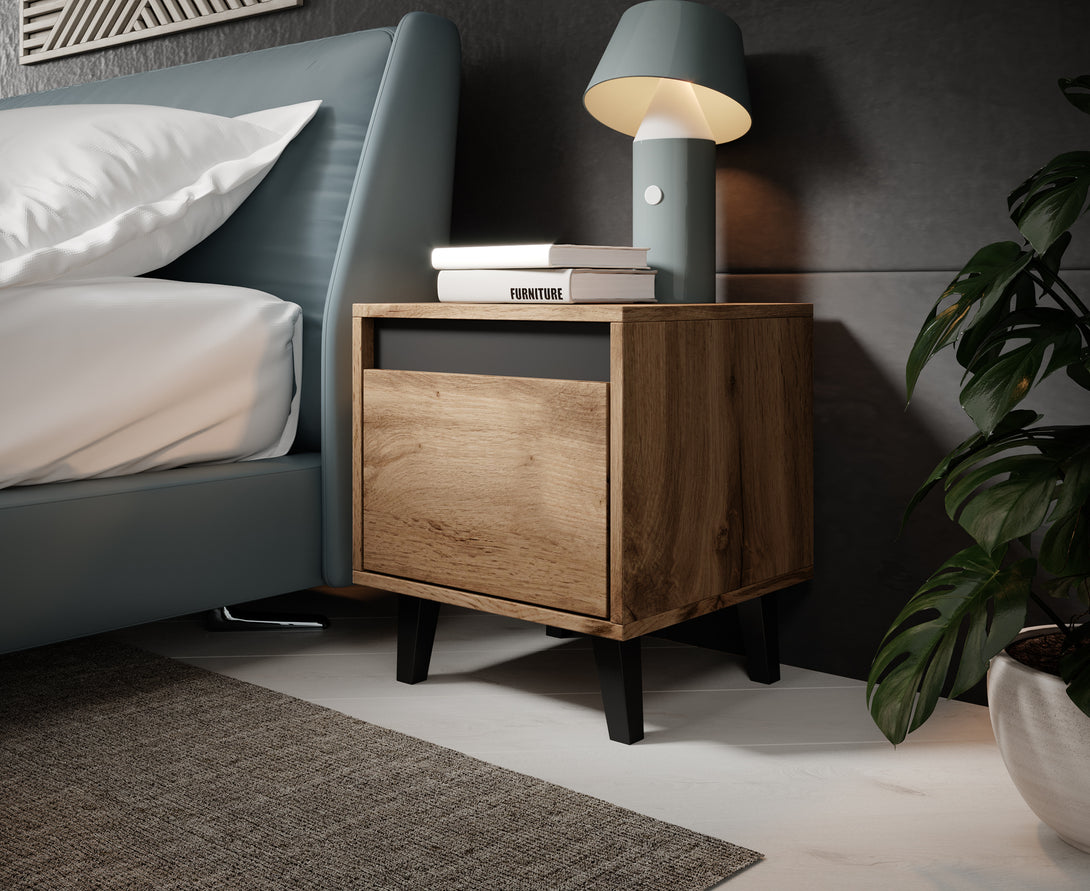Das NORD Nachttisch-Set besteht aus zwei stilvollen Beistelltischen, die sich ideal als Nachttische oder kleine Kommoden im Schlafzimmer eignen. Ihr besonderes Design mit umlaufendem Kufengestell in Anthrazit setzt elegante Akzente und verleiht dem Möbelstück eine moderne Note.Die warme Holzoptik in Wotan Eiche sorgt für ein harmonisches Erscheinungsbild, das sich leicht mit unterschiedlichen Einrichtungsstilen kombinieren lässt. Die stabile Verarbeitung und das kompakte Format machen das Set zur perfekten Wahl für funktionale und zugleich dekorative Raumlösungen.