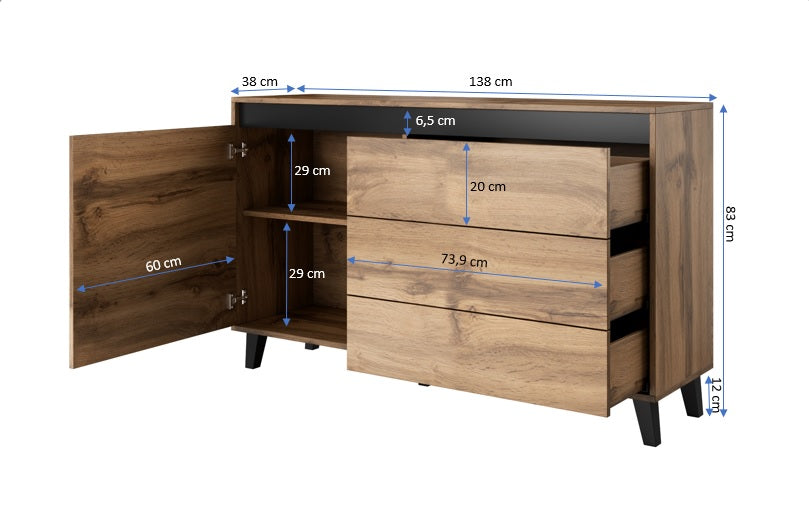 Das NORD Sideboard vereint stilvolles Design mit funktionaler Raffinesse. Die elegante Kombination aus einer warmen Wotan Eiche Front und markanten Kufenfüßen in Anthrazit sorgt für einen modernen, kontrastreichen Look, der in jedem Wohnraum Akzente setzt. Die ungewöhnliche Fußkonstruktion verleiht dem Möbelstück eine schwebende Optik und unterstreicht das zeitgemäße Erscheinungsbild. Gleichzeitig überzeugt das Sideboard durch seine hochwertige Verarbeitung und bietet viel Stauraum für verschiedenste Wohnbedürfnisse – ideal für stilvolle und organisierte Wohnkonzepte.