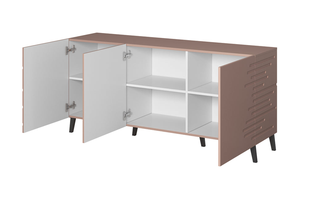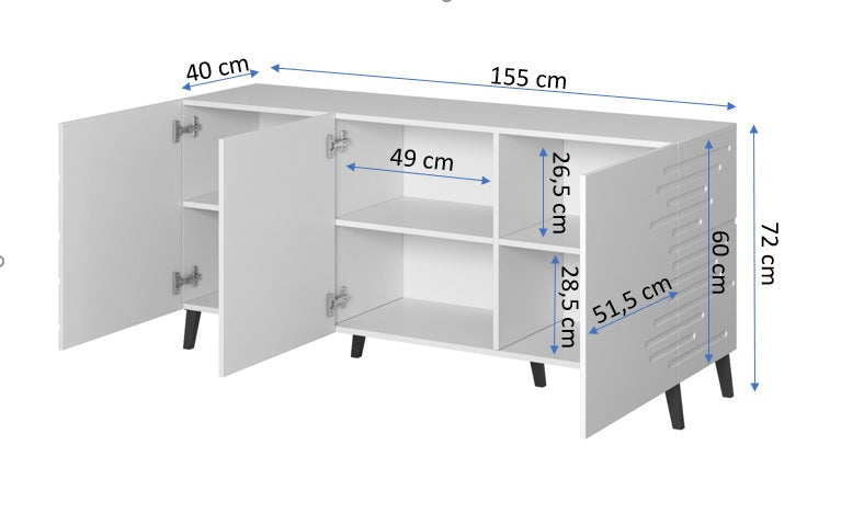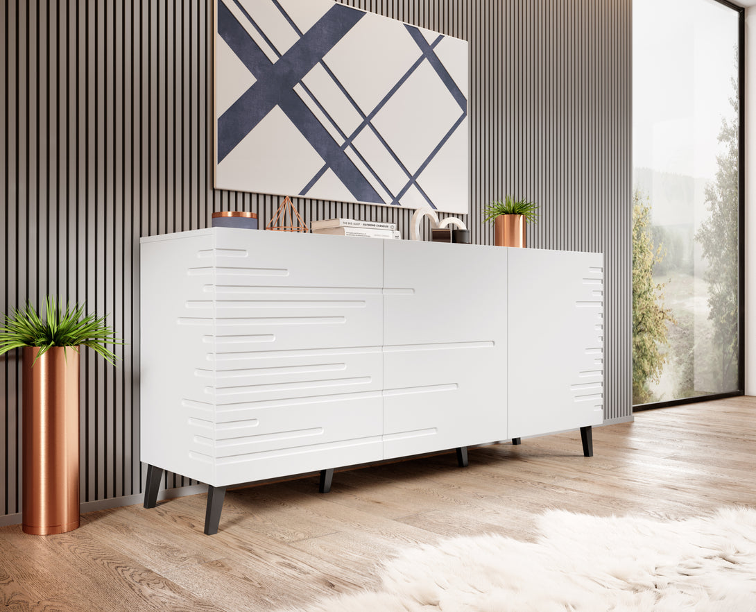 Die stilvolle Kommode NOVA mit einer Breite von 155 cm vereint modernes Design mit funktionaler Ausstattung. Ihre eleganten, gefrästen Fronten aus MDF setzen einen dekorativen Akzent, während die grifflose Optik und die matten Oberflächen dem Möbelstück einen zeitgemäßen Charakter verleihen.