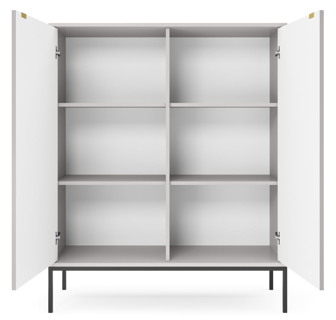 Der NOVA SANDS Highboard besticht durch sein modernes Design und die hochwertige Verarbeitung. Die Front aus gefrästem MDF in Weiß Matt kombiniert mit einem robusten Metallgestell sorgt für eine langlebige und elegante Optik. Dieses Möbelstück bietet großzügigen Stauraum und ist perfekt für das stilvolle Wohnzimmer oder Büro geeignet. Die klare Linienführung und die harmonische Materialkombination machen den Schrank zu einem zeitlosen Begleiter für jede Einrichtung.