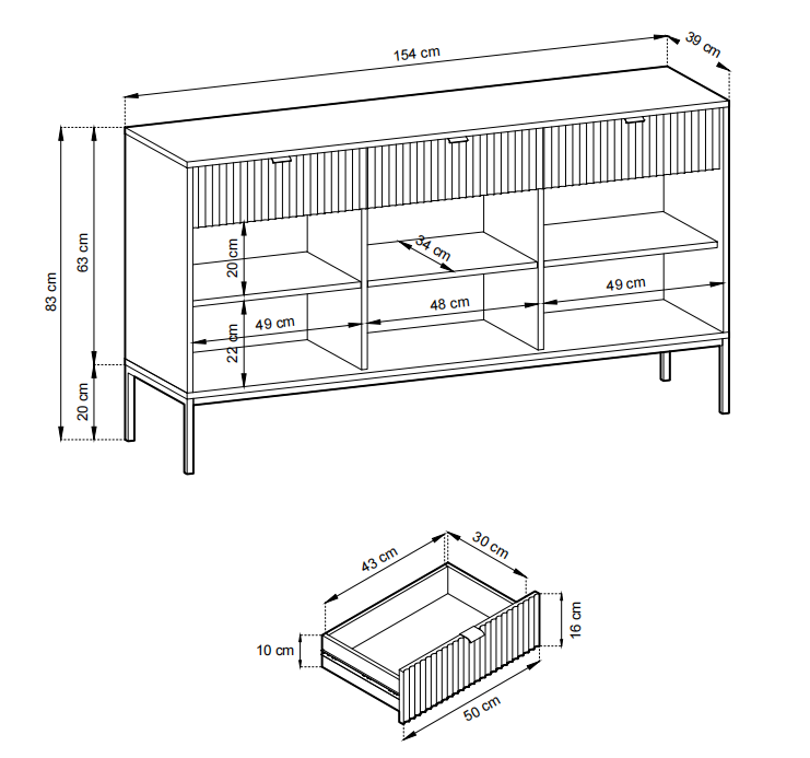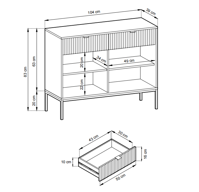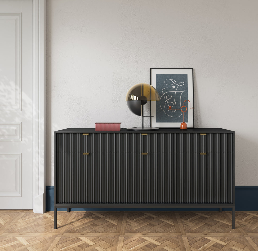 Die NOVA SANDS Kommode überzeugt durch ihr elegantes Design und die Kombination hochwertiger Materialien. Die gefrästen MDF-Fronten verleihen dem Möbelstück eine edle Optik, während der stabile Metallrahmen für Langlebigkeit sorgt. Die Kommode eignet sich perfekt als stilvolle Aufbewahrungslösung im Wohnzimmer, Schlafzimmer oder Flur und fügt sich mühelos in moderne Einrichtungskonzepte ein. Durch die praktische Einteilung bietet sie ausreichend Stauraum für unterschiedlichste Alltagsgegenstände und schafft Ordnung mit Stil.