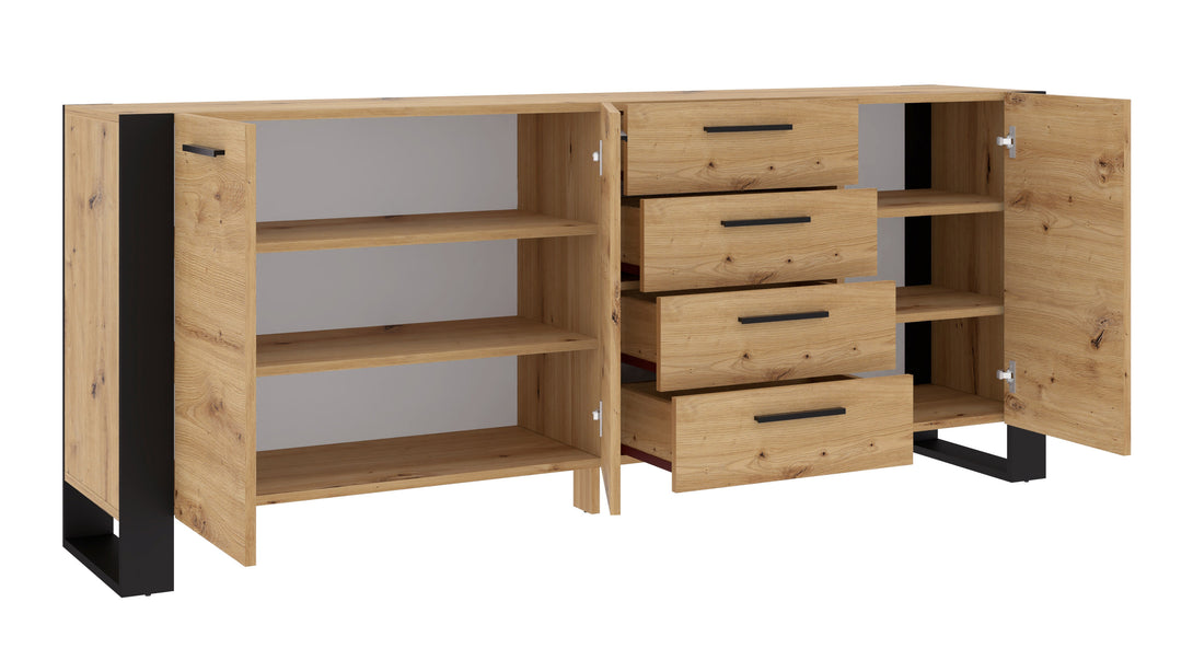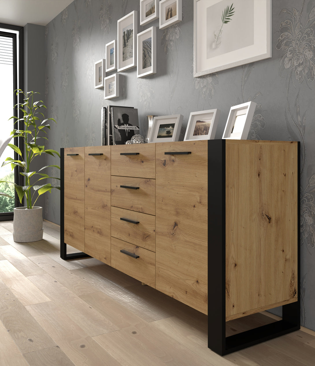 Die NUKA Kommode K vereint modernes Design mit praktischer Funktionalität und passt perfekt in stilvolle Wohn- und Schlafzimmer. Der elegante Artisan Eichen-Look wird durch das markante schwarze Metallrahmengestell wirkungsvoll ergänzt, wodurch ein ausdrucksstarkes und gleichzeitig natürliches Erscheinungsbild entsteht. Die hochwertige Verarbeitung und die klare Linienführung unterstreichen den zeitgemäßen Charakter dieses Möbelstücks.