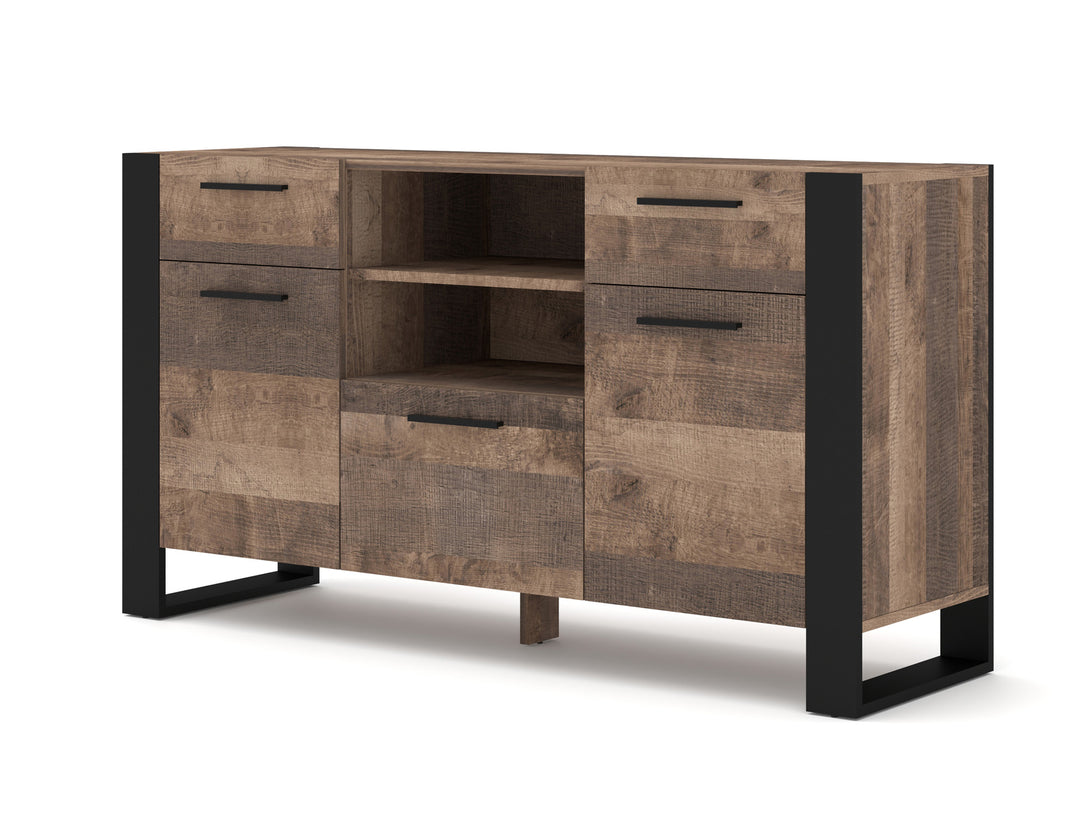 Das NUKA Wohnzimmer-Set vereint modernes Design mit hoher Funktionalität und umfasst zwei stilvolle Möbelstücke: die NUKA Kommode mit 155 cm Breite und das NUKA TV-Lowboard mit 200 cm Breite. Beide Stücke präsentieren sich in eleganter Holzoptik mit markanten schwarzen Rahmenfüßen, die für Stabilität und ein ansprechendes Erscheinungsbild sorgen. Die Kombination aus geschlossenen und offenen Fächern sowie Schubladen ermöglicht eine durchdachte und praktische Aufbewahrung für Ihr Wohnzimmer.