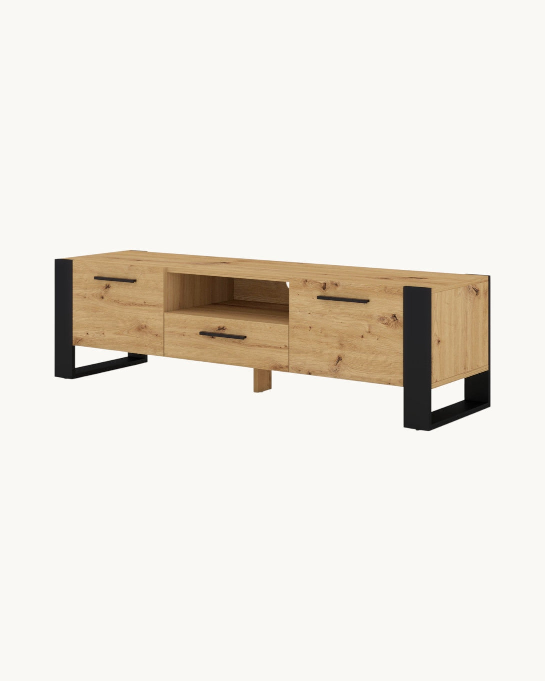 Das NUKA Wohnzimmerset besteht aus vier eleganten Möbelstücken: einer Vitrine, einem TV-Board, einer Kommode und einem Couchtisch. Alle Teile sind in der trendigen Artisan Eiche Holzoptik gefertigt und verfügen über schwarze rahmenförmige Beine, die für hohe Stabilität sorgen. Die Vitrine besticht durch eine Kombination aus Glas- und geschlossenen Fächern, das TV-Board bietet viel Stauraum mit drei verschließbaren Fächern und einem offenen Fach für Multimedia-Geräte. Die Kommode kombiniert Schubladen und offene Regalfächer und der Couchtisch verfügt über eine praktische Ablagefläche. Das Set verbindet modernes Design mit hoher Funktionalität und eignet sich ideal für stilvolle Wohnzimmer.