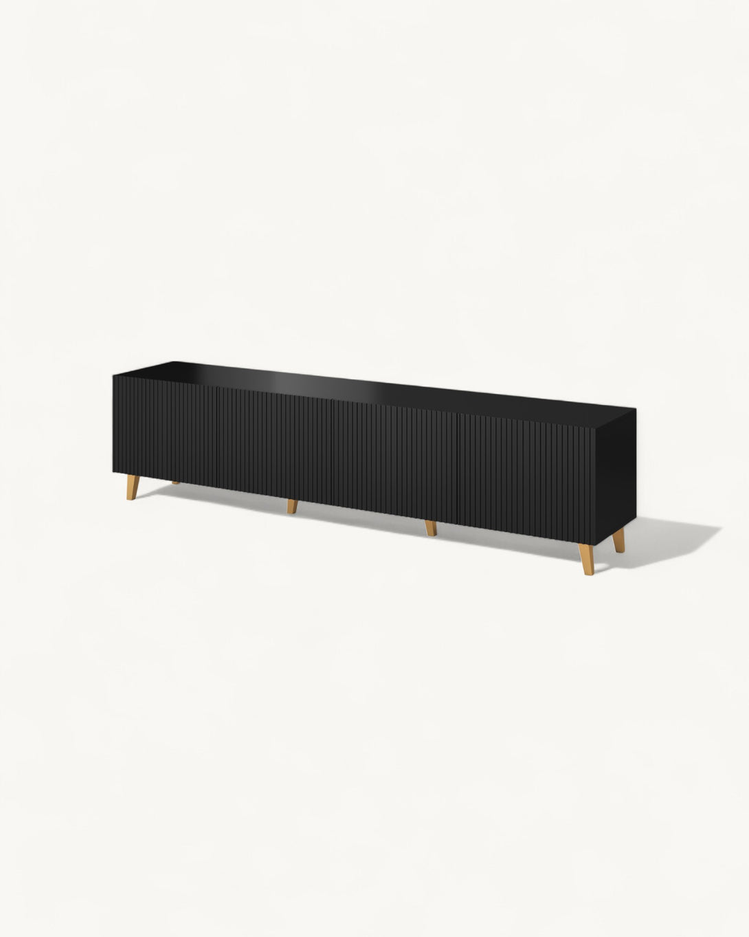 Der PAFOS TV-Schrank mit einer Breite von 200 cm überzeugt durch seine stilvolle Optik und hohe Funktionalität. Die grifflosen, gefrästen Fronten aus MDF verleihen dem Möbelstück eine moderne und gleichzeitig zeitlose Ausstrahlung. Das durchdachte Design bietet Ihnen die Möglichkeit, flexibel zu entscheiden, welcher Bereich offen bleiben soll – ideal für eine individuelle Raumgestaltung im skandinavischen oder modernen Stil.