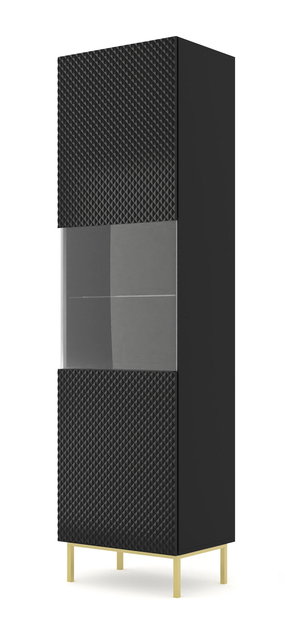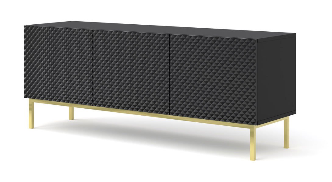 4-teilige Wohnzimmermöbel-Set aus der Serie Ravenna B. Das Set besteht aus einer Kommode mit drei Türen, einem TV-Lowboard mit vier Türen, einer Vitrine mit einer Tür und einer Schublade in einem Metallrahmen sowie einem Couchtisch mit Ablage. Die Möbel zeichnen sich durch ein modernes und elegantes Design mit goldenen Metallfüßen und einem grifflosen Push-to-Open-System aus. Die Möbel vereinen attraktives Aussehen mit hoher Funktionalität. Die verwendeten Materialien sind von hoher Qualität und gewährleisten Langlebigkeit sowie einfache Handhabung. Ideal für moderne Wohnzimmer mit einem Hauch von Luxus.