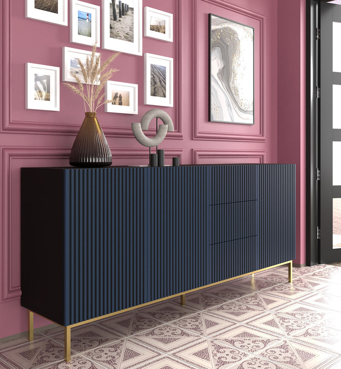Die RAVENNA F Kommode vereint exklusives Design mit praktischer Funktionalität für moderne Wohnräume. Die gefrästen und lackierten MDF-Fronten in Navy Blau sorgen für einen stilvollen Blickfang, während der Korpus in Schwarz matt eine edle Basis bildet. Der goldfarbene Metallrahmen unterstreicht das elegante Erscheinungsbild und sorgt für Stabilität. Dank der grifflose Push-to-Open-Technologie bleibt die Optik klar und minimalistisch.
