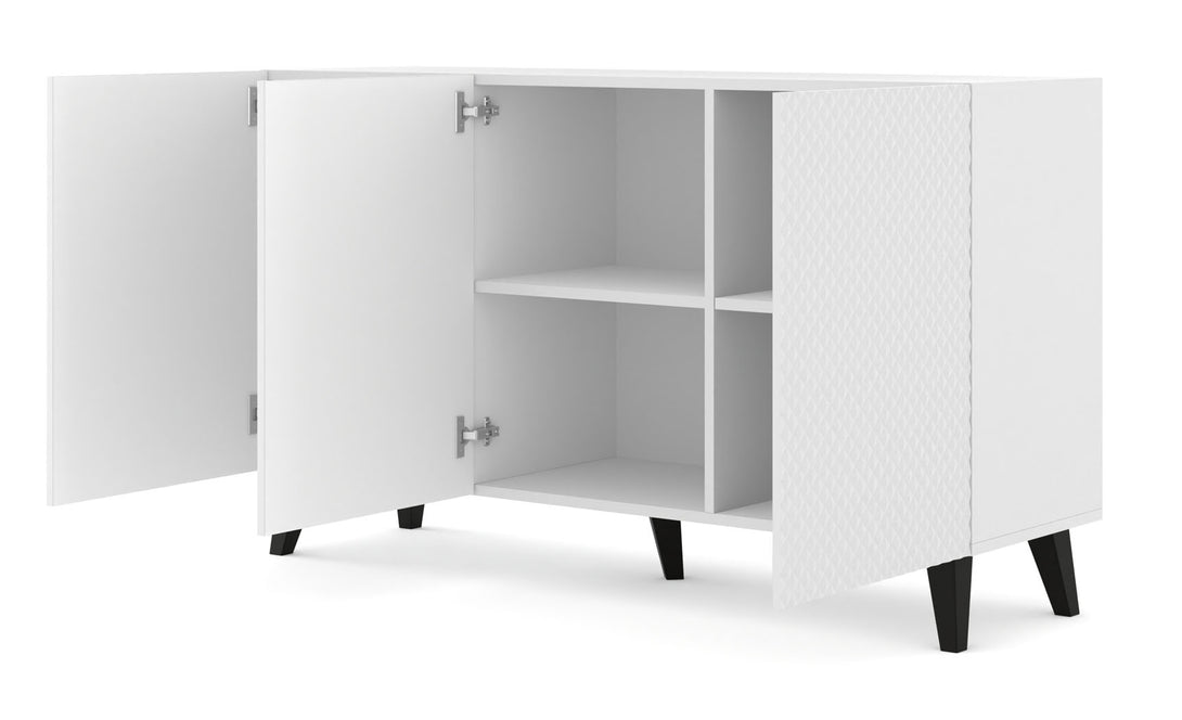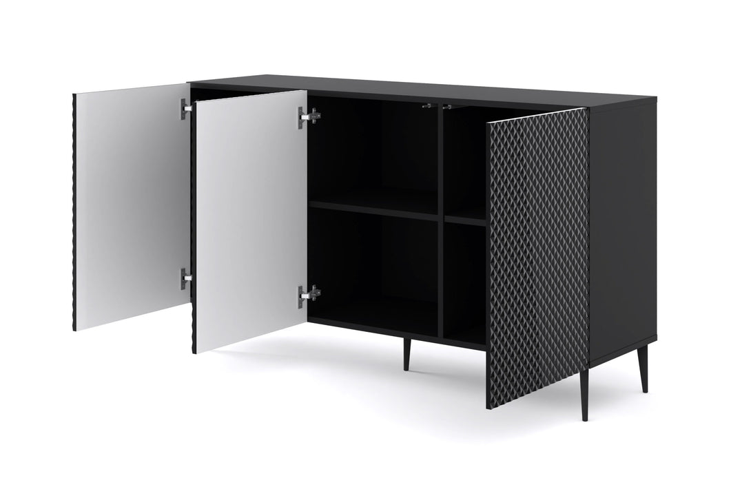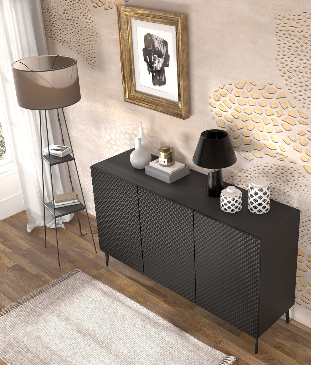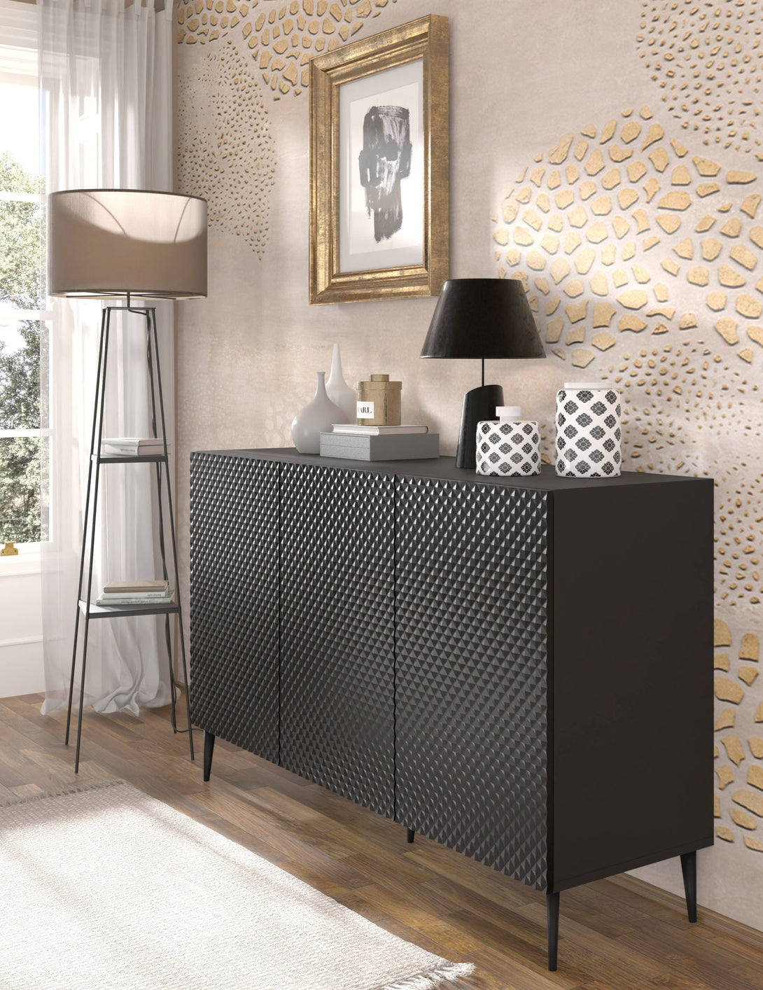 Mit drei geschlossenen Türen bietet das Sideboard großzügigen Stauraum für Geschirr, Unterlagen oder Wohnaccessoires. Die strukturierte Frontgestaltung und die klaren Linien machen die Kommode zu einem funktionalen und gleichzeitig dekorativen Element für jedes Wohn- oder Esszimmer.