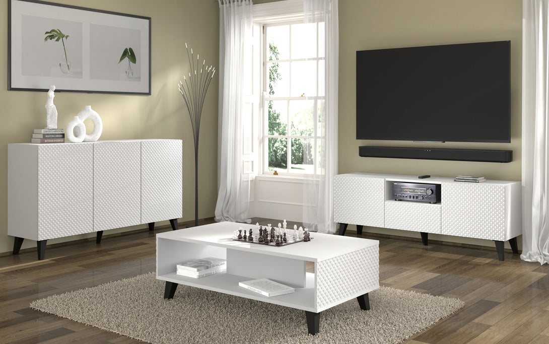 Die RAVENNA P Kommode besticht durch ihr elegantes Design und ihre hochwertige Verarbeitung. Die diamantgefrästen Hochglanzfronten in Weiß setzen edle Akzente und verleihen dem Möbelstück eine moderne Ausstrahlung. Der mattweiße Korpus in Kombination mit schwarzen Kunststofffüßen sorgt für stilvollen Kontrast und eine stabile Basis. Das grifflose Design mit Push-to-Open-Funktion unterstreicht das minimalistische Erscheinungsbild.