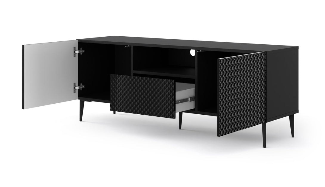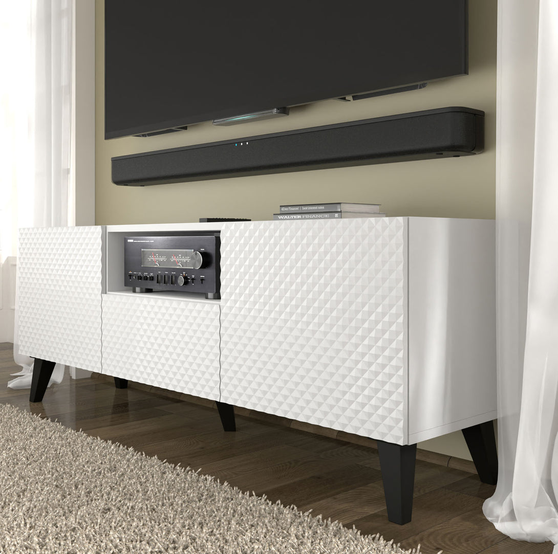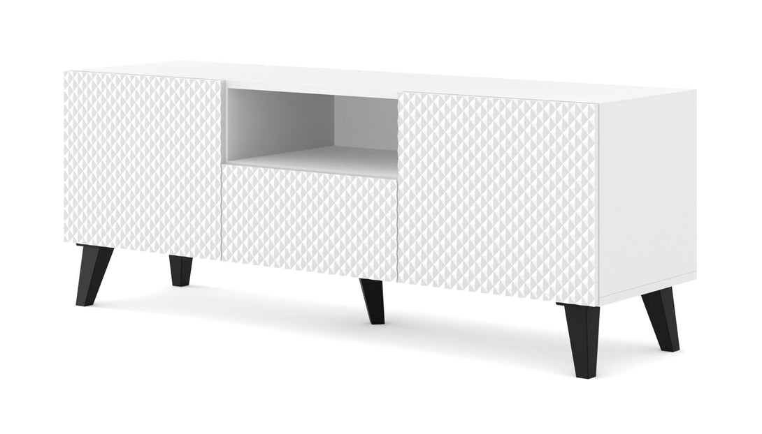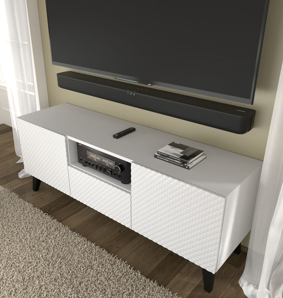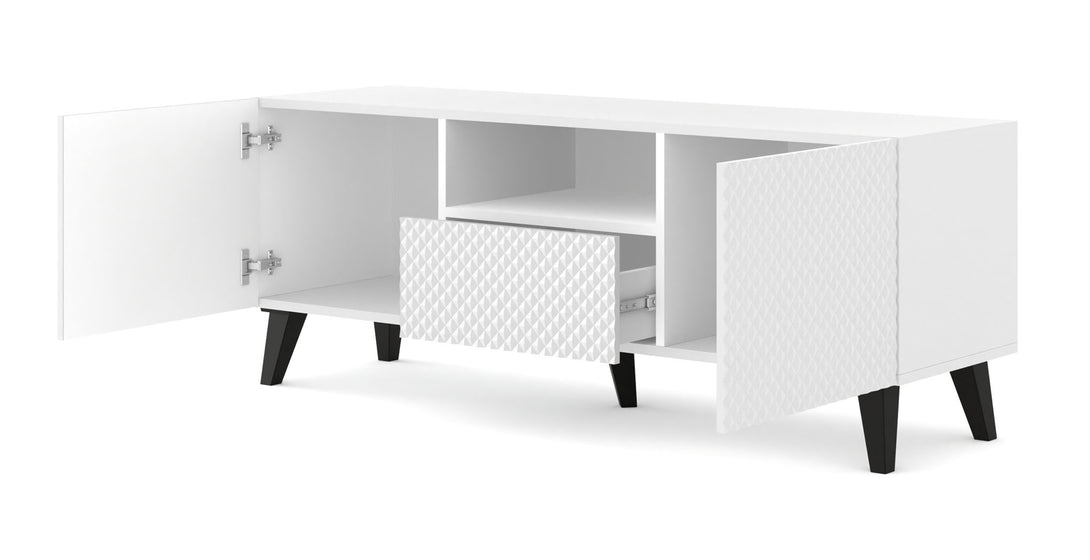 Das RAVENNA P TV-Lowboard vereint modernes Design mit dekorativen Highlights und bietet gleichzeitig durchdachte Funktionalität. Die auffällig diamantförmig gefrästen Fronten in Hochglanz Weiß verleihen dem Möbelstück ein luxuriöses Erscheinungsbild. Der Korpus in Weiß Matt sorgt für stilvolle Kontraste, während griffloses Design und Push-to-Open-Technologie das minimalistische Konzept perfekt abrunden. Zwei Türen, eine Schublade und ein offenes Fach mit Kabeldurchlass bieten viel Stauraum für Medientechnik und Zubehör.
