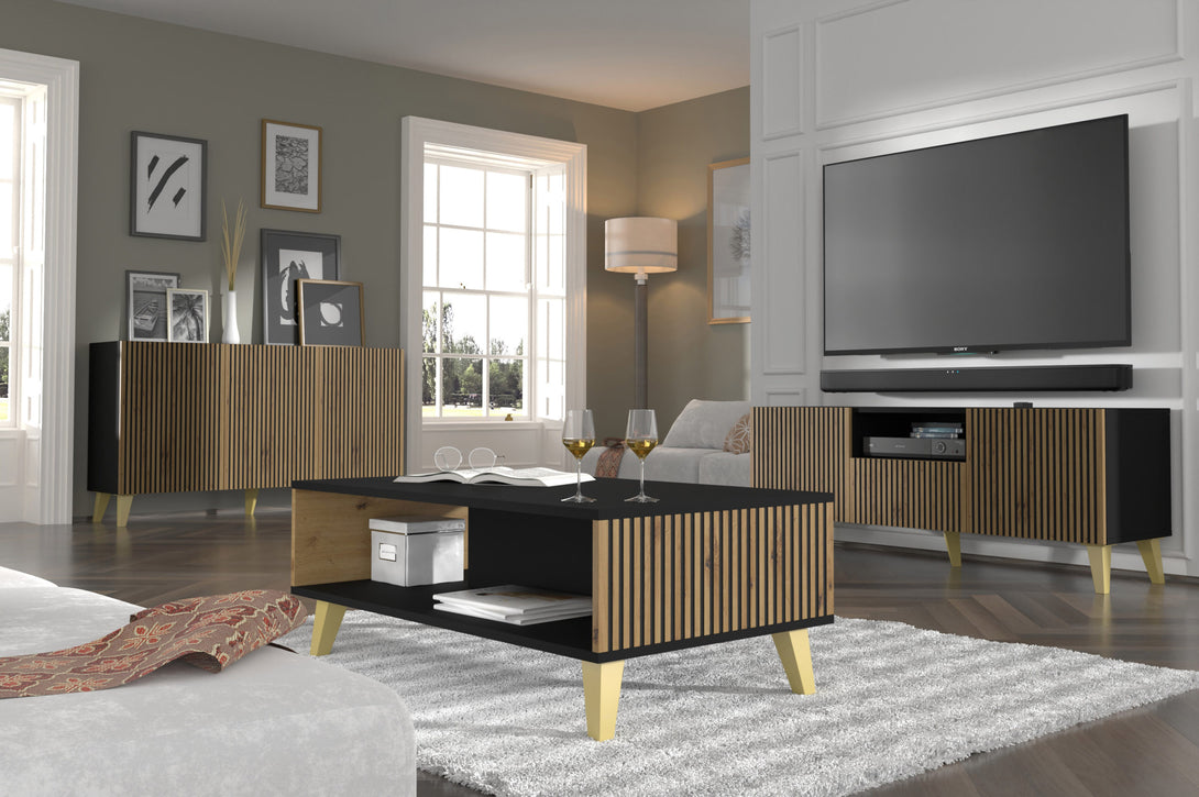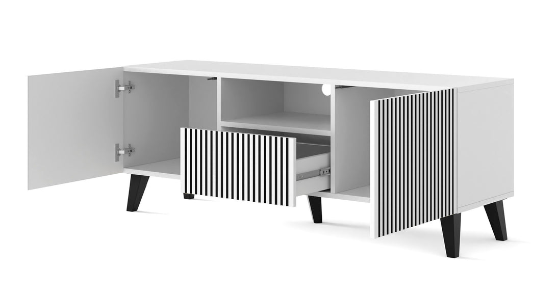 Zwei geschlossene Fächer, eine Schublade und ein offenes Ablagefach bieten ausreichend Stauraum für Multimedia-Geräte und Zubehör. Die mattschwarzen Kunststofffüße sorgen für Stabilität und heben den eleganten Charakter des Möbels hervor. Dieses Lowboard vereint zeitgemäßes Design mit praktischer Funktionalität.