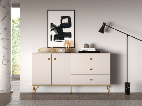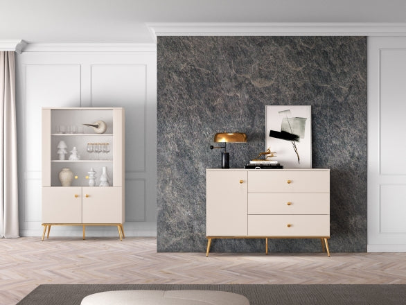Die große SELGIN Kommode ist die ideale Lösung für stilvolle und praktische Aufbewahrung. Hinter den Türen befinden sich Regale, die großzügigen Stauraum für Kleidung, Handtücher oder Bettwäsche bieten. Diese Kommode ist perfekt, um verschiedene Haushaltsgegenstände organisiert und griffbereit zu verstauen. Das breite Oberteil eignet sich hervorragend zur Präsentation von Vasen, Dekorationen oder persönlichen Erinnerungsstücken. Das Möbelstück steht auf stabilen, hohen Metallbeinen, die eine einfache Reinigung und hohe Standfestigkeit ermöglichen. Die doppelt galvanisierten Griffe und die goldfarbenen Beine garantieren eine komfortable und langlebige Nutzung. Die SELGIN Kollektion vereint hohe Funktionalität mit einem beeindruckenden, modernen Design.