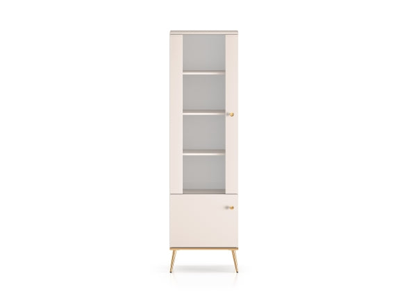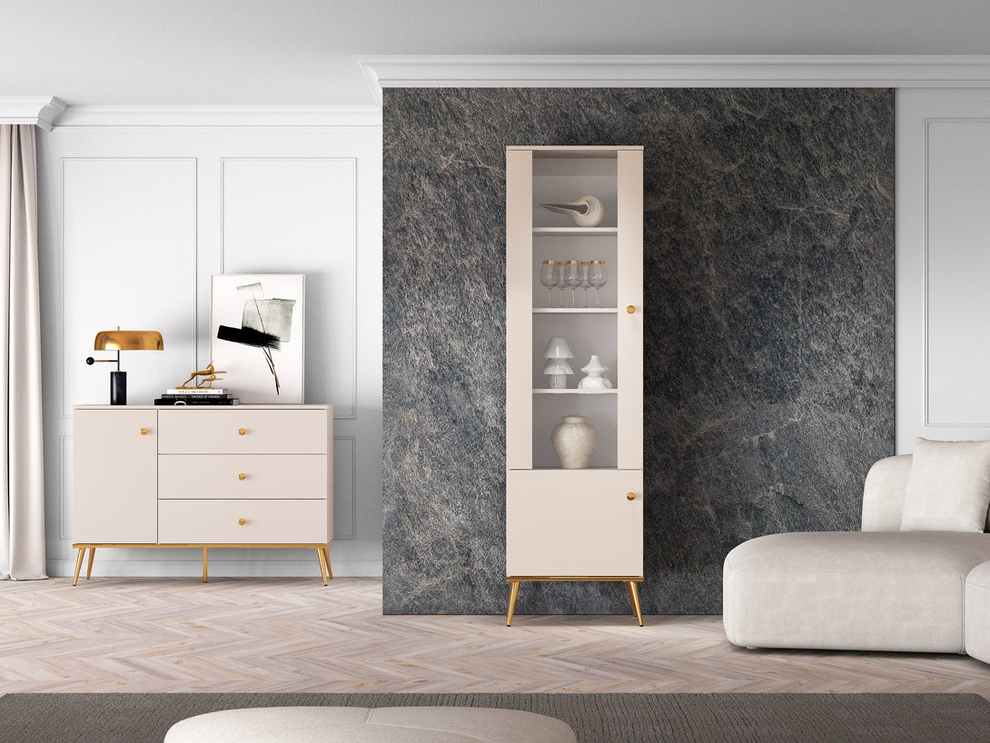 Das Selgin Set besteht aus einer stilvollen Vitrine und einer funktionalen Kommode. Die Vitrine bietet hinter Glastüren vier Fächer, ideal zur Präsentation von Gläsern, Porzellan oder Reisesouvenirs. Im unteren Bereich befindet sich ein geschlossenes Fach für Tischgeschirr oder Tischdecken. Die Kommode ist ein praktisches Möbelstück mit einem Fach hinter einer Tür und vier tiefen Schubladen, die viel Stauraum für Kleidung, Dokumente oder Heimtextilien bieten. Beide Möbelstücke stehen auf stabilen, hohen Metallfüßen und zeichnen sich durch ein elegantes Design und hohe Funktionalität aus.