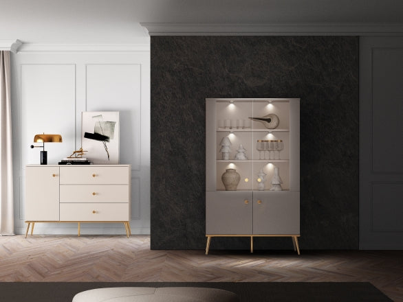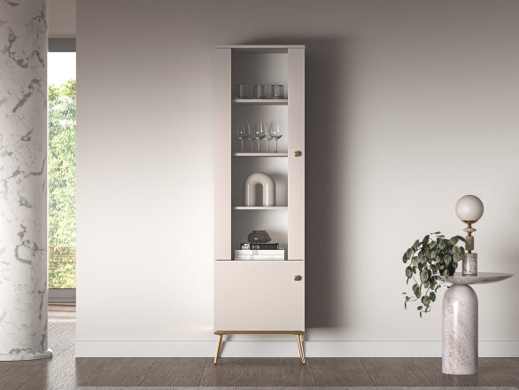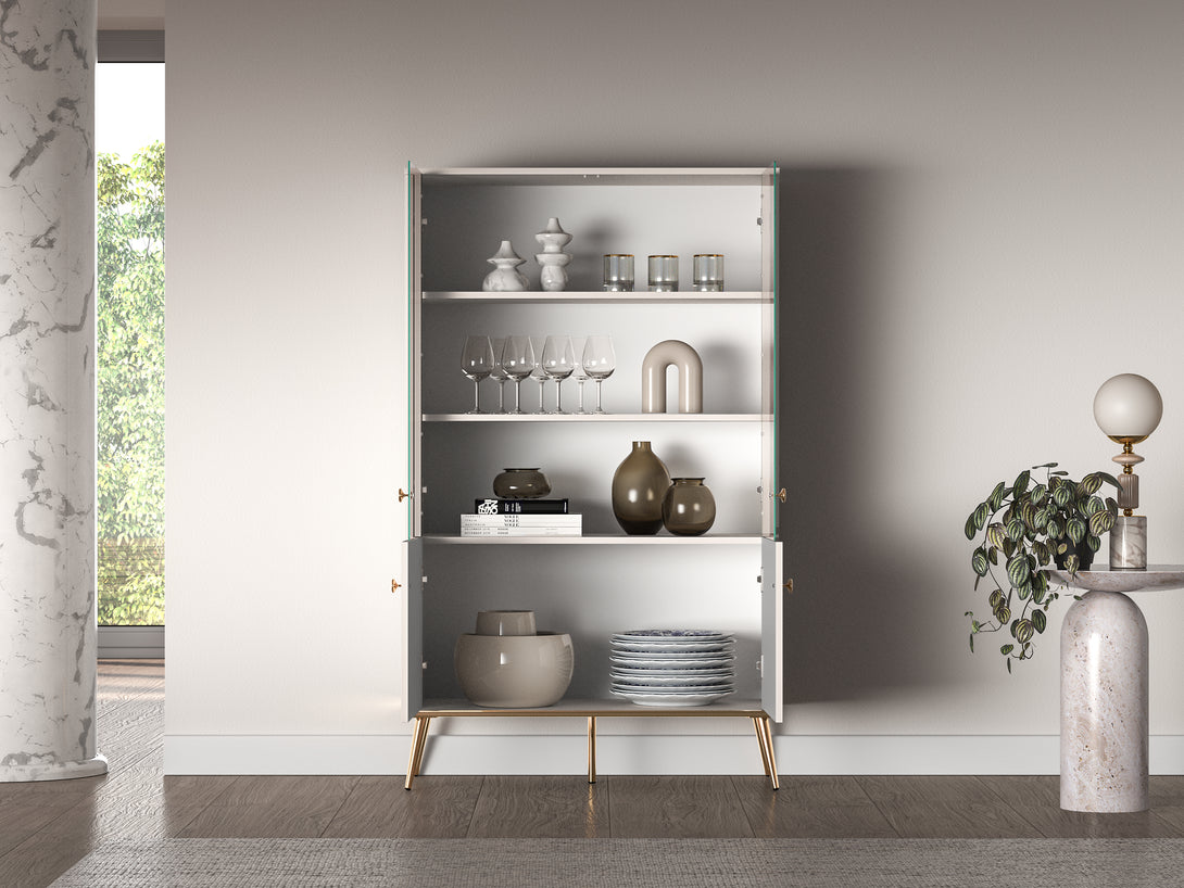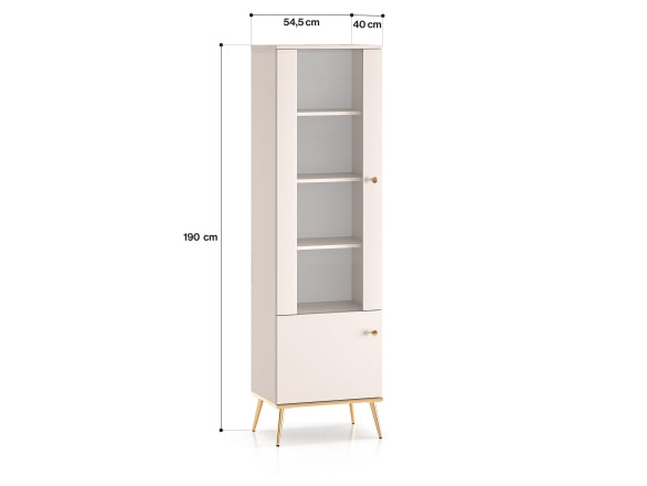 Die SELGIN Vitrine ist ein stilvolles Möbelstück, das sich perfekt zur Präsentation Ihrer Lieblingsobjekte eignet. Drei stabile Einlegeböden teilen den verglasten Innenraum in vier großzügige Fächer, ideal für Gläser, Porzellan oder dekorative Accessoires. Der untere Bereich der Vitrine bietet hinter einer geschlossenen Tür zusätzlichen Stauraum für Geschirr oder Tischwäsche. Das Möbelstück steht auf hohen, stabilen Metallfüßen, die das Reinigen des Bodens erleichtern und dem Staubsauger einen freien Zugang ermöglichen. Die doppelt galvanisierten Griffe und die Metallfüße in Goldoptik sorgen für eine langlebige und komfortable Nutzung. Die SELGIN Kollektion vereint hohe Funktionalität mit einem ansprechenden, modernen Design.
