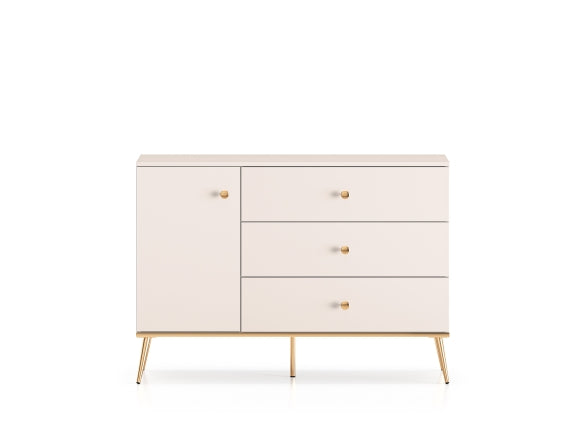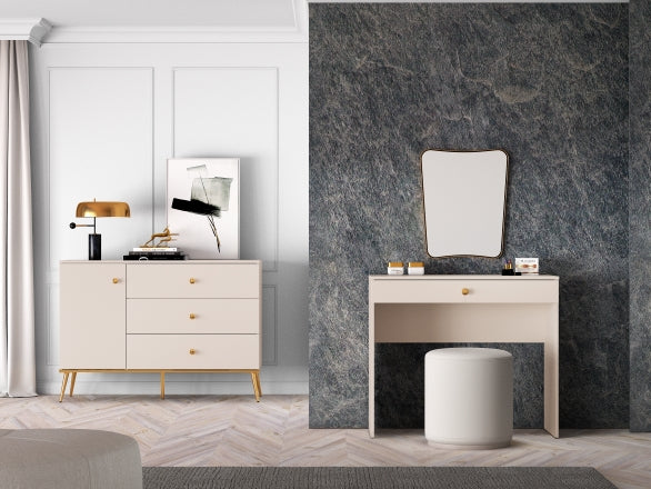 Das Set besteht aus einer Selgin Kommode und einem Schminktisch. Die Kommode bietet großzügigen Stauraum hinter einer Tür mit Einlegeboden sowie vier tiefen Schubladen, perfekt für Kleidung, Handtücher oder Dokumente. Die breite Ablagefläche eignet sich ideal zur Präsentation von Vasen, Erinnerungsstücken oder Dekorationen. Der Schminktisch überzeugt mit einer großen Ablagefläche für Parfums oder Make-up-Produkte. Die geräumige Schublade sorgt für Ordnung und macht den Tisch vielseitig einsetzbar – auch als Konsole im Flur. Beide Möbelstücke stehen auf stabilen, hohen Metallbeinen und kombinieren modernes Design mit hoher Funktionalität.