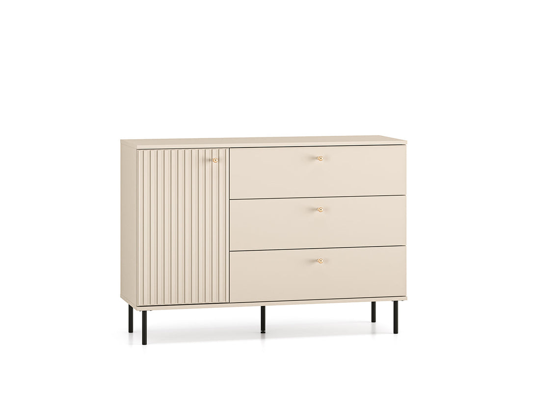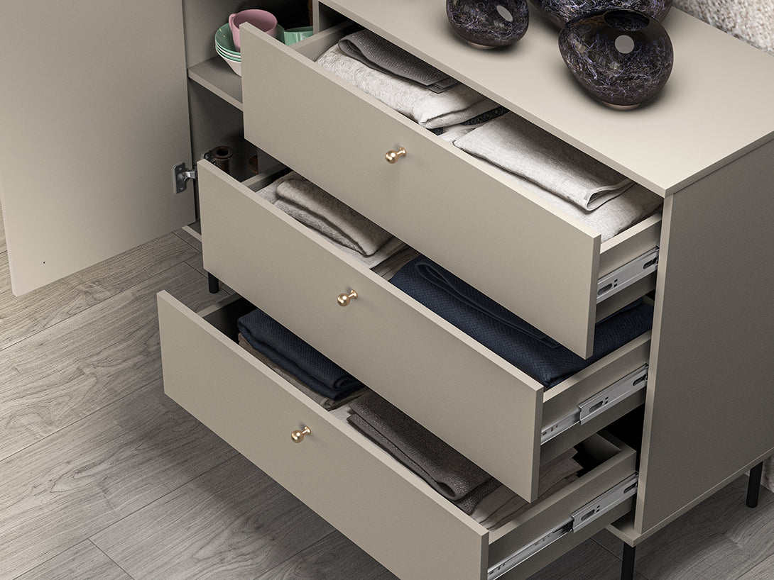 Die SOPHIE Kommode bietet eine durchdachte Kombination aus Stauraum und stilvoller Präsentationsfläche. Drei tiefe Schubladen mit verstärktem Boden und Vollauszug sorgen für Ordnung und leichten Zugriff auf Ihre Textilien oder Alltagsgegenstände. Hinter den doppelt gehaltenen Türen verbirgt sich eine breite Ablage, die zusätzlichen Stauraum in zwei großzügigen Fächern schafft. Der dekorative Kaschmir-Ton, fein gefräste MDF-Fronten, goldfarbene Griffe und schwarze Metallfüße verleihen dem Möbelstück eine moderne, elegante Ausstrahlung, die sich harmonisch in Wohn- oder Schlafräume integriert.