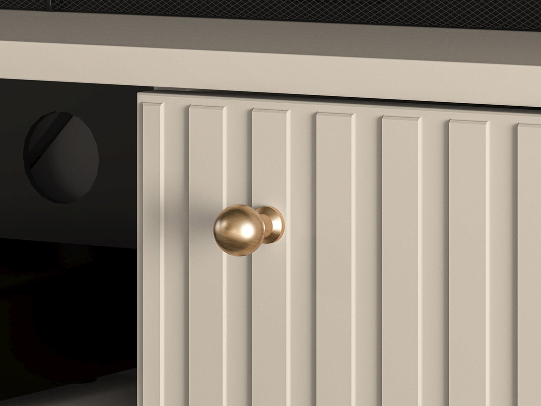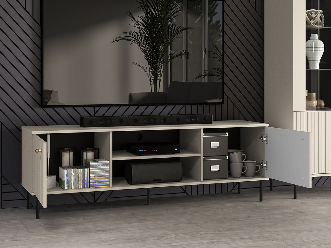 Das SOPHIE 06 TV-Lowboard ist die perfekte Lösung für stilvolle Medienaufbewahrung im Wohnzimmer. Zwei geschlossene Fächer bieten großzügigen Stauraum für Zubehör, während offene Ablagen Platz für Multimedia-Geräte schaffen. Die breite Oberplatte eignet sich ideal für Ihren Fernseher oder dekorative Elemente. Die elegante Gestaltung in Kaschmirdekor mit gefrästen MDF-Fronten, goldfarbenen Knöpfen und schlanken schwarzen Metallfüßen steht für moderne Ästhetik und Funktionalität zugleich und passt sich nahtlos in verschiedenste Interieurs ein.