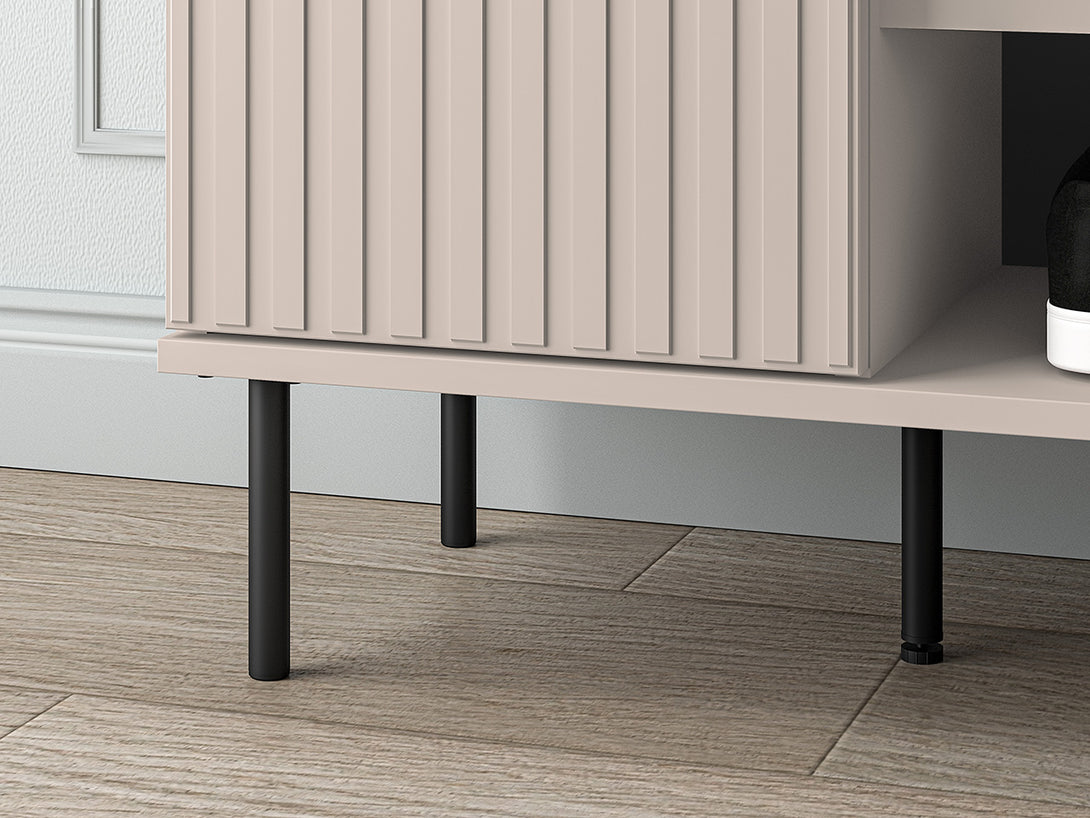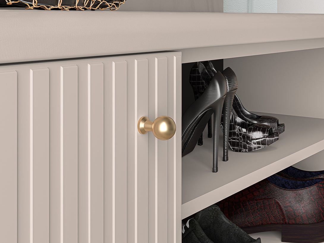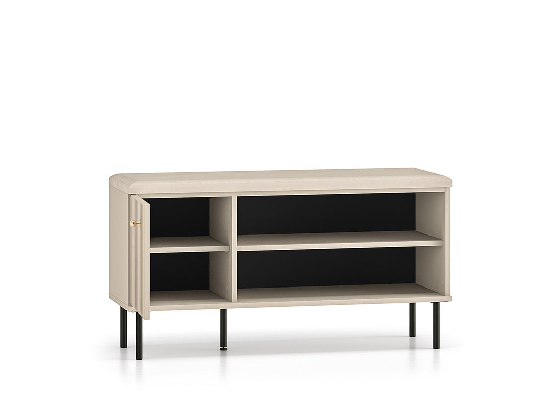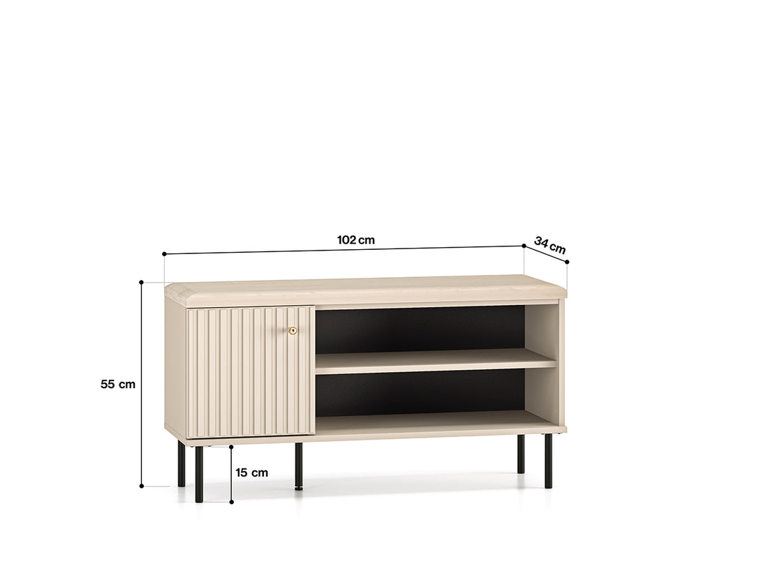 Die SOPHIE 15 Schuhbank kombiniert stilvolles Design mit praktischen Funktionen für den modernen Eingangsbereich. Zwei offene Fächer bieten Platz für alltägliche Schuhe, während sich hinter der Tür mit Soft-Close-Funktion zusätzlicher Stauraum verbirgt. Die weich gepolsterte Sitzfläche in passender Kaschmirfarbe sorgt für Komfort beim An- und Ausziehen der Schuhe. Das Gesamtbild wird durch dekorative MDF-Fronten mit Fräsung, goldfarbene Griffe und schwarze Metallfüße stilvoll abgerundet.SOPHIE 15 ist mehr als nur ein funktionales Möbelstück – sie steht für zeitlose Eleganz und bringt Ordnung sowie Stil in jeden Flur.