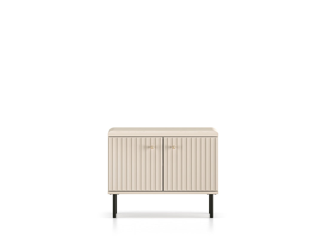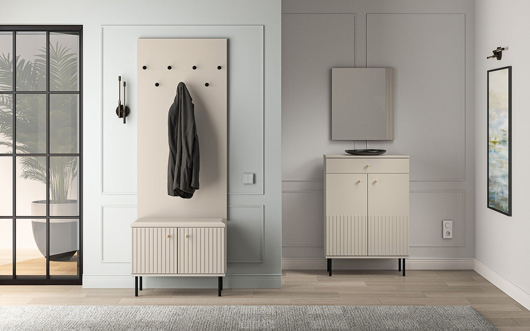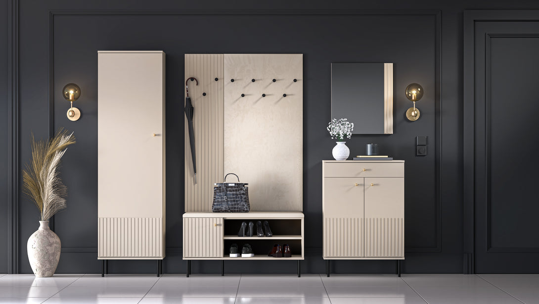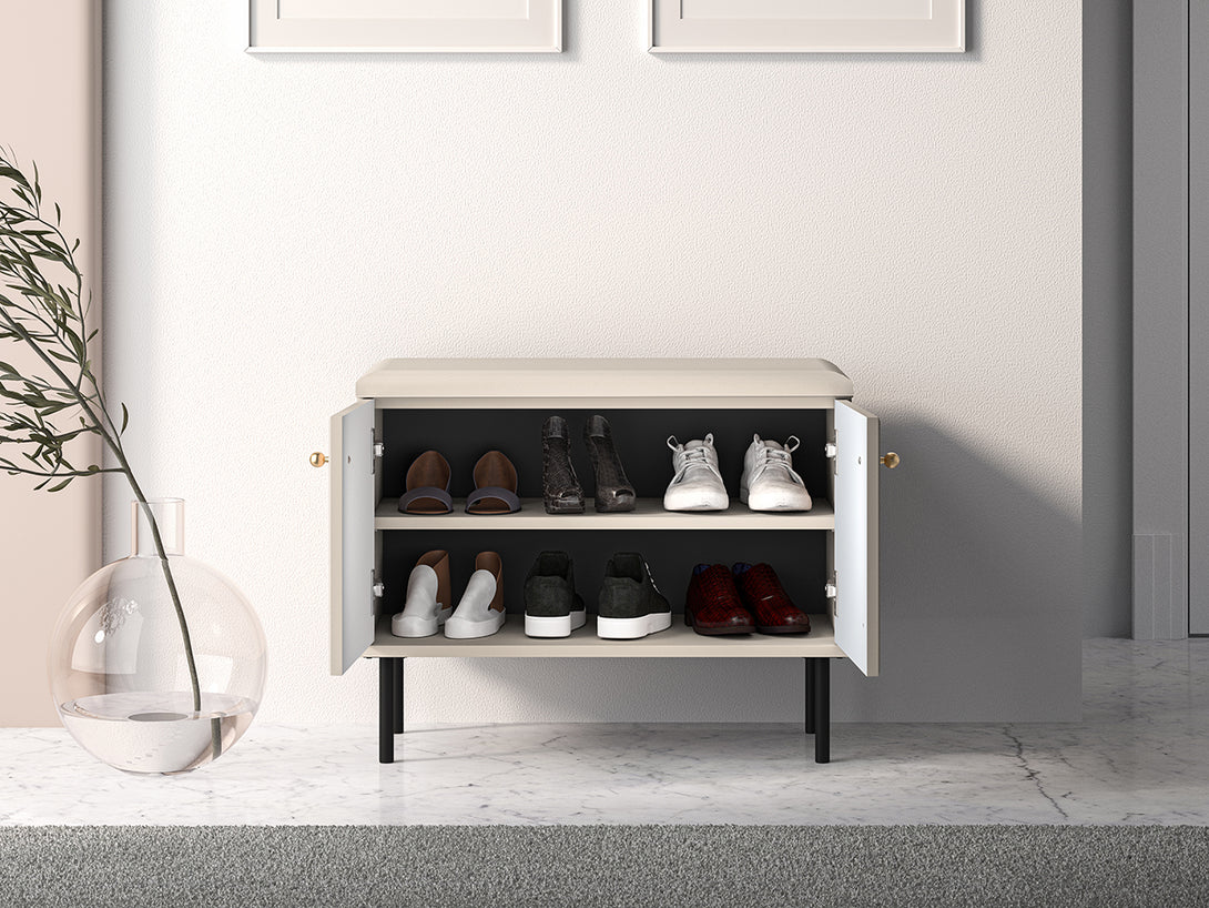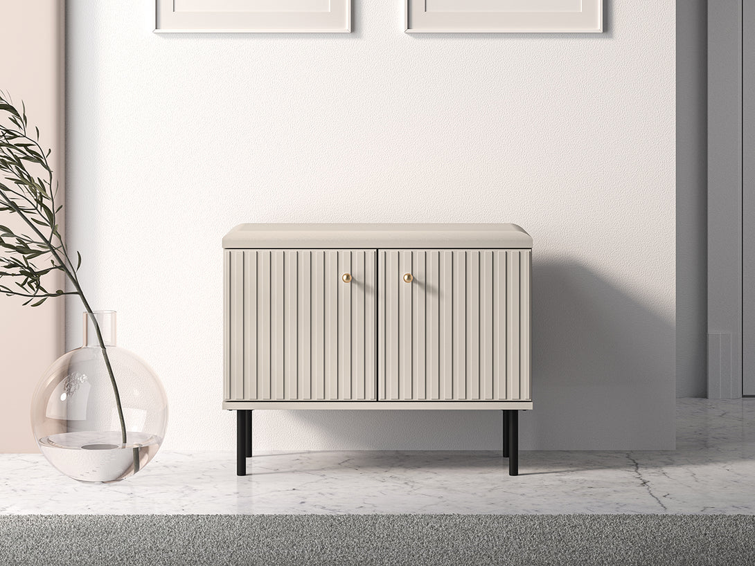 Die SOPHIE 16 Schuhbank bietet eine stilvolle und praktische Lösung für den Eingangsbereich. Hinter den doppeltürigen MDF-Fronten befinden sich zwei großzügige Fächer, die ausreichend Platz für mehrere Paar Schuhe bieten. Die gepolsterte Sitzfläche in passender Kaschmirfarbe sorgt für maximalen Komfort beim Anziehen. Das edle Design wird durch feine Fräsungen, goldfarbene Griffe und elegante schwarze Metallfüße perfekt ergänzt.SOPHIE 16 überzeugt nicht nur durch Funktionalität, sondern auch durch moderne Ästhetik. Der hochwertige Materialmix und die harmonische Farbgebung machen dieses Möbelstück zu einem stilvollen Blickfang für jeden Flur.