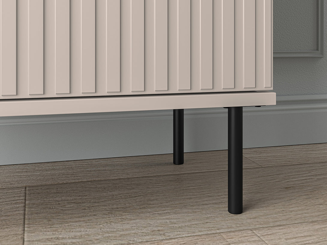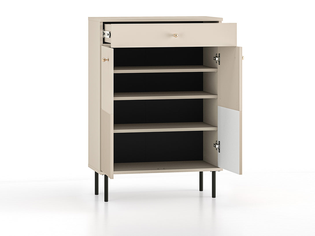 Das dreiteilige SOPHIE Möbel-Set vereint Funktionalität, zeitgemäßes Design und hochwertige Verarbeitung. Bestehend aus einem großzügigen Kleiderschrank mit Spiegelfronten, einer eleganten Schuhkommode und einem stilvollen Wandspiegel, schafft dieses Ensemble ein harmonisches Gesamtbild im modernen Schlafzimmer. Charakteristisch für die gesamte Kollektion sind die kaschmirfarbenen MDF-Fronten mit feinen Fräsungen sowie dezente schwarze Metallfüße und edle goldfarbene Griffe.