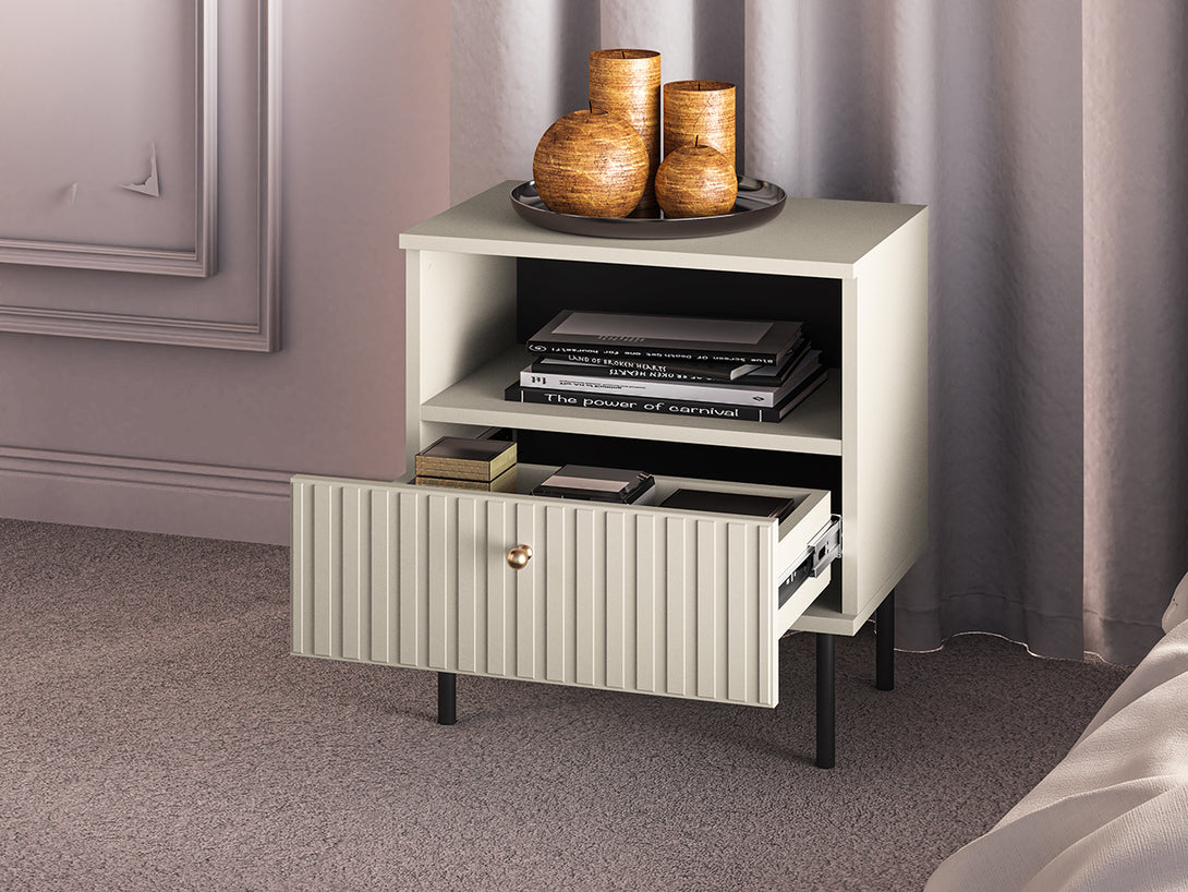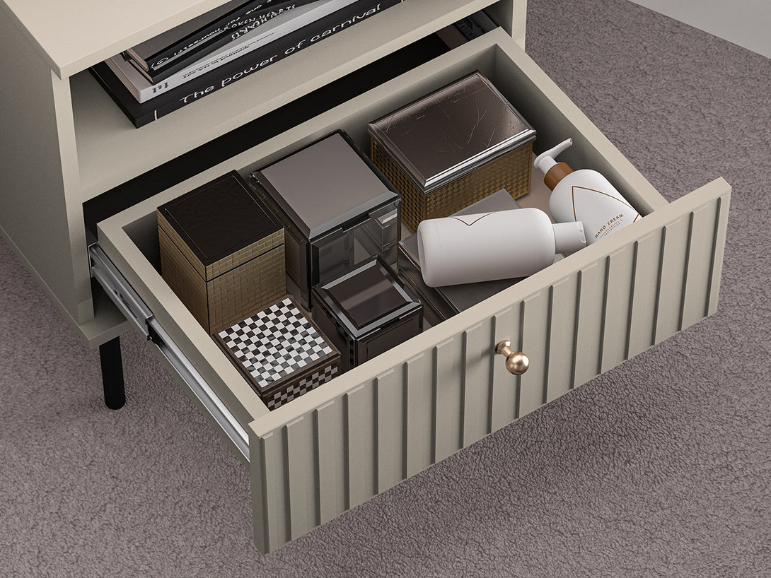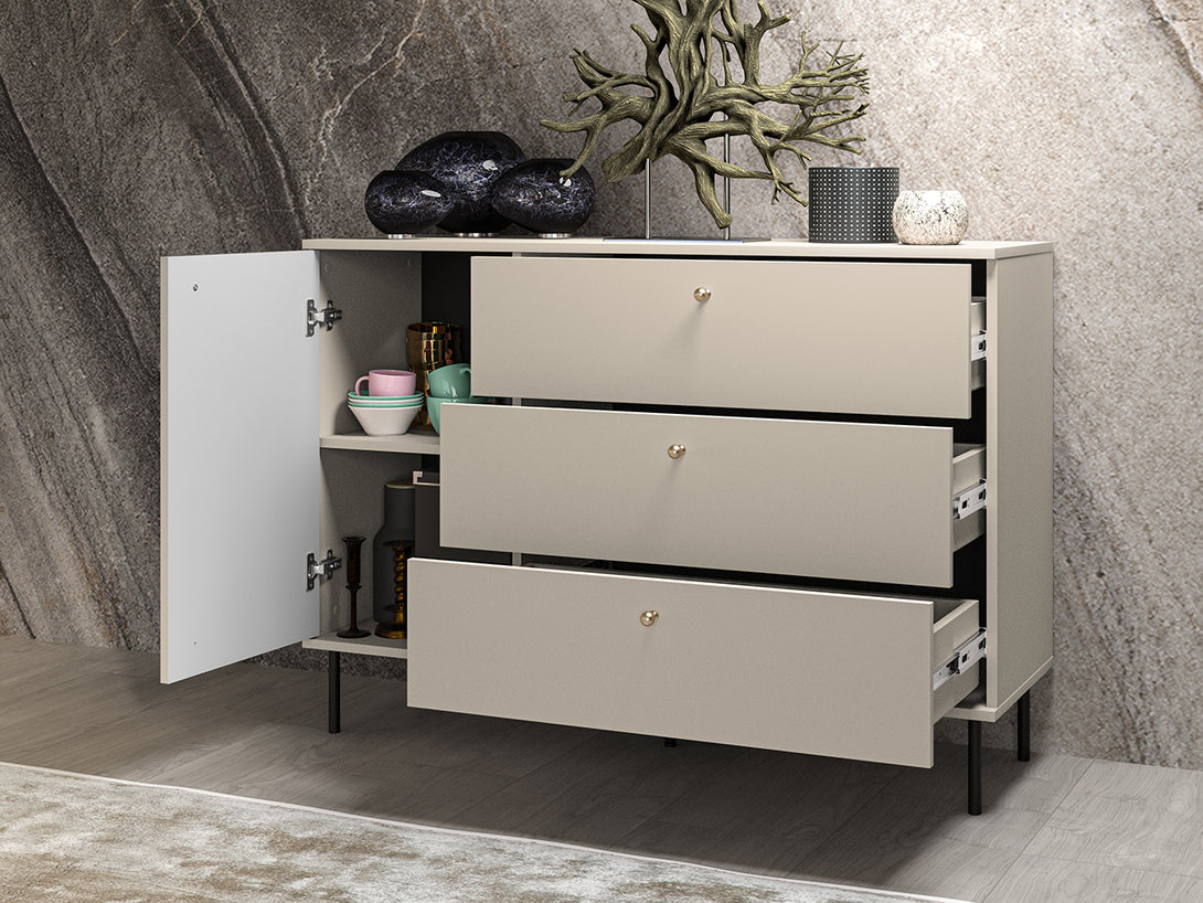 Das SOPHIE Set vereint modernes Design mit hoher Funktionalität und bringt eine stilvolle Atmosphäre in Ihr Zuhause. Die hochwertige Verarbeitung, kaschmirfarbene MDF-Fronten mit feiner Fräsung sowie goldfarbene Metallgriffe unterstreichen die elegante Linie der gesamten Kollektion. Ob im Schlafzimmer oder im Wohnbereich – dieses Möbelset passt sich harmonisch jedem Einrichtungsstil an und bietet durchdachten Stauraum für unterschiedlichste Bedürfnisse. Mit leisen Schließmechanismen, voll ausziehbaren Schubladen und robusten Materialien sorgt es für maximalen Komfort im Alltag und verleiht Ihrem Interieur eine edle Note.