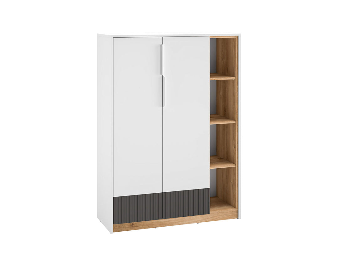 Die TORINO 05 Kommode vereint modernes Design mit hoher Funktionalität und schafft durch ihre stilvolle Optik einen eleganten Akzent in jedem Wohnraum. Die harmonische Kombination aus weißer Front mit MDF in grafitmattem Dekor und Elementen in Dąb Castello verleiht diesem Möbelstück eine warme und zugleich zeitgemäße Ausstrahlung. Diese Kommode bietet großzügigen Stauraum für Kleidung, Accessoires oder Alltagsgegenstände und überzeugt durch ihre präzise Verarbeitung und langlebige Qualität. Dank leiser Schließmechanismen und hochwertiger Materialien garantiert die TORINO 05 Kommode eine komfortable Nutzung im täglichen Gebrauch.