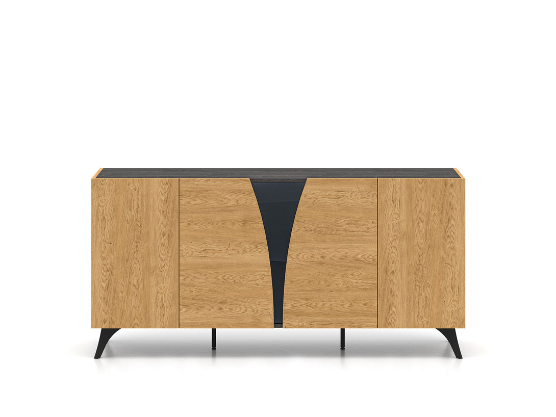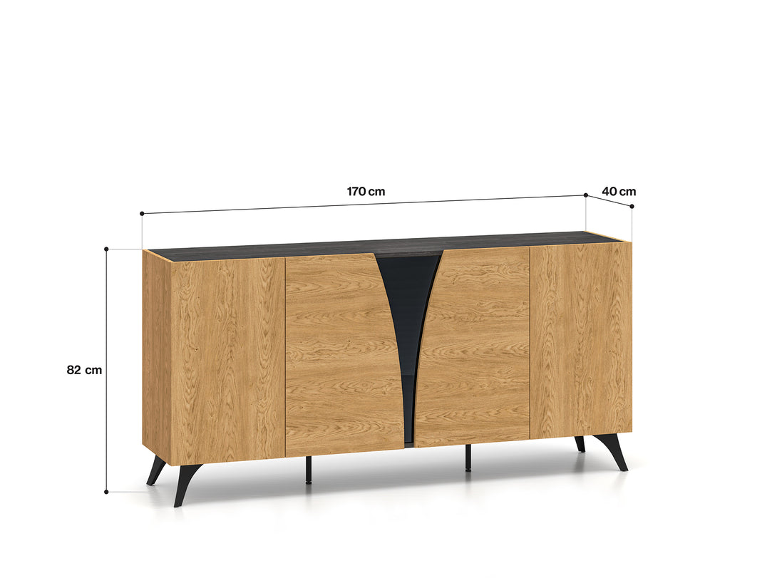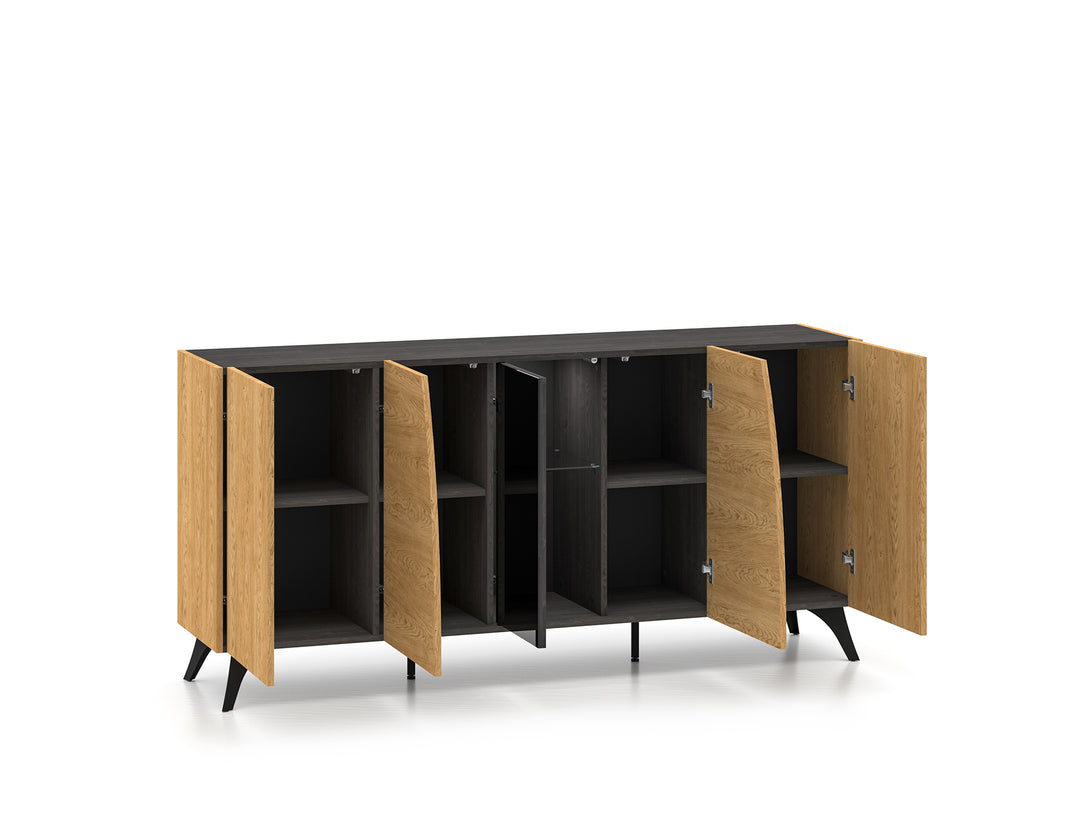 Die große Kommode Toscania bietet großzügigen Stauraum hinter vier Türen, die insgesamt vier geräumige Fächer verbergen – ideal zur Aufbewahrung von Kleidung, Handtüchern oder Geschirr. In der Mitte des Möbels befindet sich ein integriertes Barfach mit Glasboden, das sich beim Öffnen der Tür automatisch beleuchtet und Platz für Gläser, Getränke oder Accessoires bietet. Die großzügige obere Ablagefläche eignet sich perfekt, um Vasen oder Reiseerinnerungen stilvoll zu präsentieren. Die Toscania 04 Kommode vereint hohe Funktionalität mit modernem Design. Grifflose Fronten und klare Linien unterstreichen die zeitgemäße Optik dieses vielseitigen Möbelstücks.