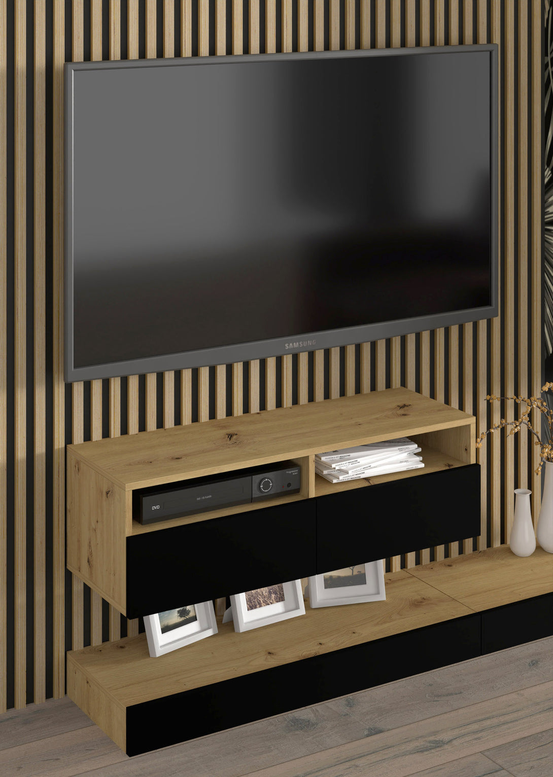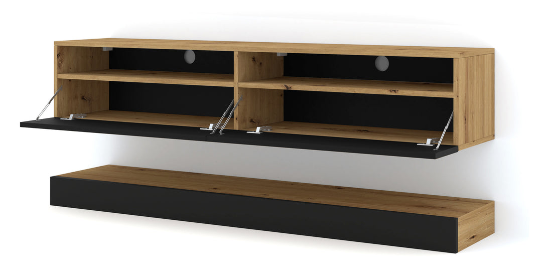 Das DUO TV-Lowboard vereint modernes Design mit praktischer Funktionalität in einem stilvollen Möbelstück. Die zweistufige Konstruktion besteht aus einem wandhängenden Element mit zwei geschlossenen Fächern und zwei offenen Ablagen sowie einer separat stehenden Bodenplattform. Die kontrastreiche Kombination aus Holzoptik in Artisan Eiche und mattem Schwarz sorgt für ein elegantes Erscheinungsbild.