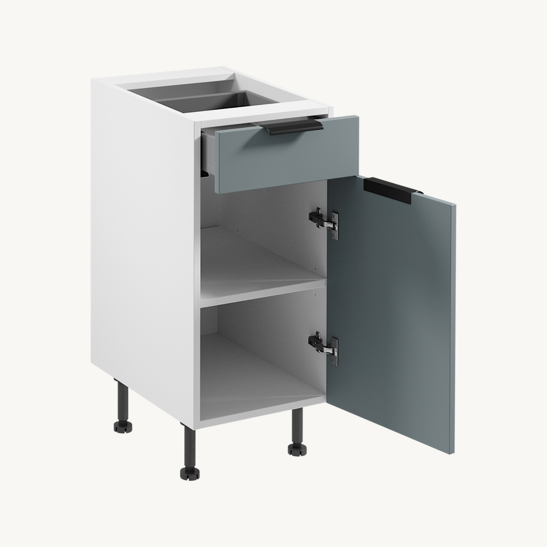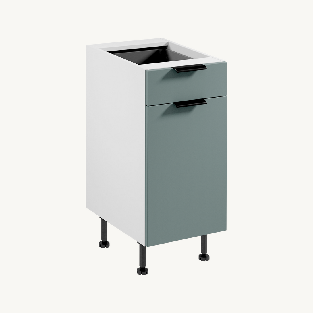 Der Livaro Unterschrank D40S1 P/L kombiniert modernes Design mit hoher Funktionalität. Ausgestattet mit einer geräumigen Schublade mit Vollauszug und einer Tür darunter bietet er optimalen Stauraum für Küchenutensilien. Die robuste, 18 mm starke Laminatplatte ist widerstandsfähig gegen Kratzer und Feuchtigkeit, während die Farbkombination Weiß / Grün für eine frische und elegante Atmosphäre sorgt.