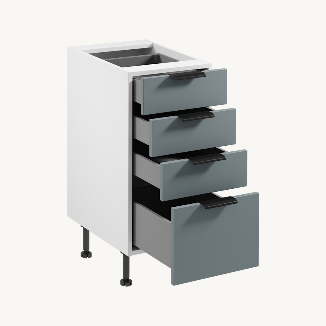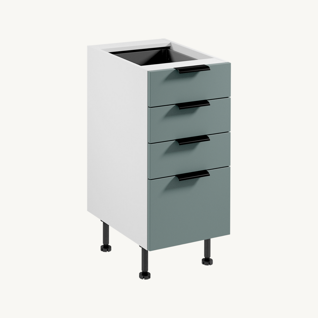Der Livaro Unterschrank D40S4 AX kombiniert modernes Design mit hoher Funktionalität. Mit vier praktischen Schubladen, die jeweils bis zu 40 kg tragen können, bietet er optimalen Stauraum für Küchenutensilien und Zubehör. Das Soft-Close-System garantiert leises, sanftes Schließen und ein angenehmes Nutzungserlebnis. Die langlebige, 18 mm starke Laminatplatte und die elegante Farbkombination Weiß / Grün sorgen für eine frische und stilvolle Küchenatmosphäre.