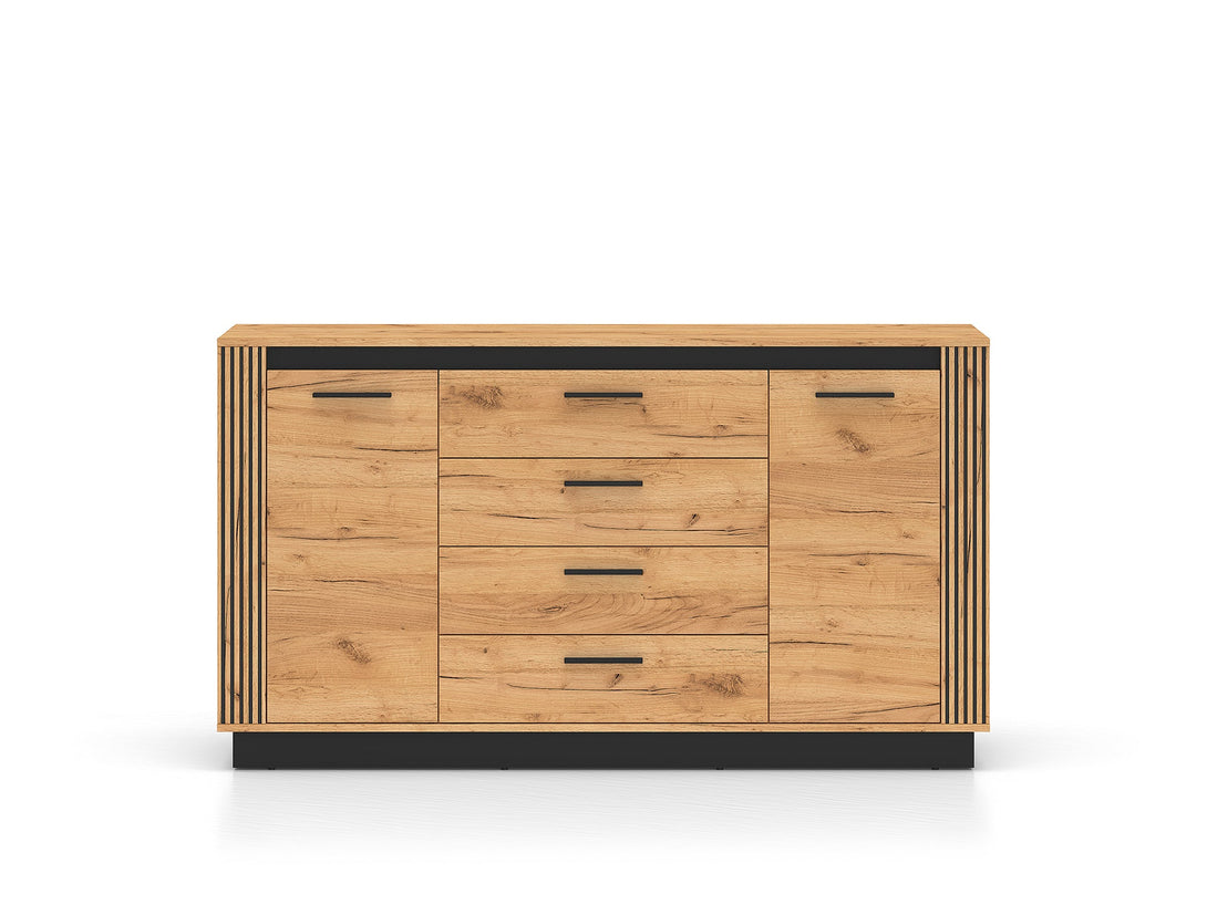 Die URSO Kommode besticht durch ihre hochwertige Verarbeitung mit Gold Craft Oak Front und schwarzen Einsätzen, die dem Möbelstück eine elegante und zeitgemäße Optik verleihen. Ausgestattet mit Soft-Close-Schubladen und ABS-Kanten bietet sie maximale Funktionalität und Langlebigkeit für den täglichen Gebrauch. Die vollausziehbaren Schubladen mit erhöhter Tragfähigkeit ermöglichen eine einfache und praktische Nutzung in jedem Wohn- oder Essbereich. Dank ihrer klaren Linien und robusten Laminatoberfläche fügt sich die Kommode harmonisch in moderne Einrichtungskonzepte ein.