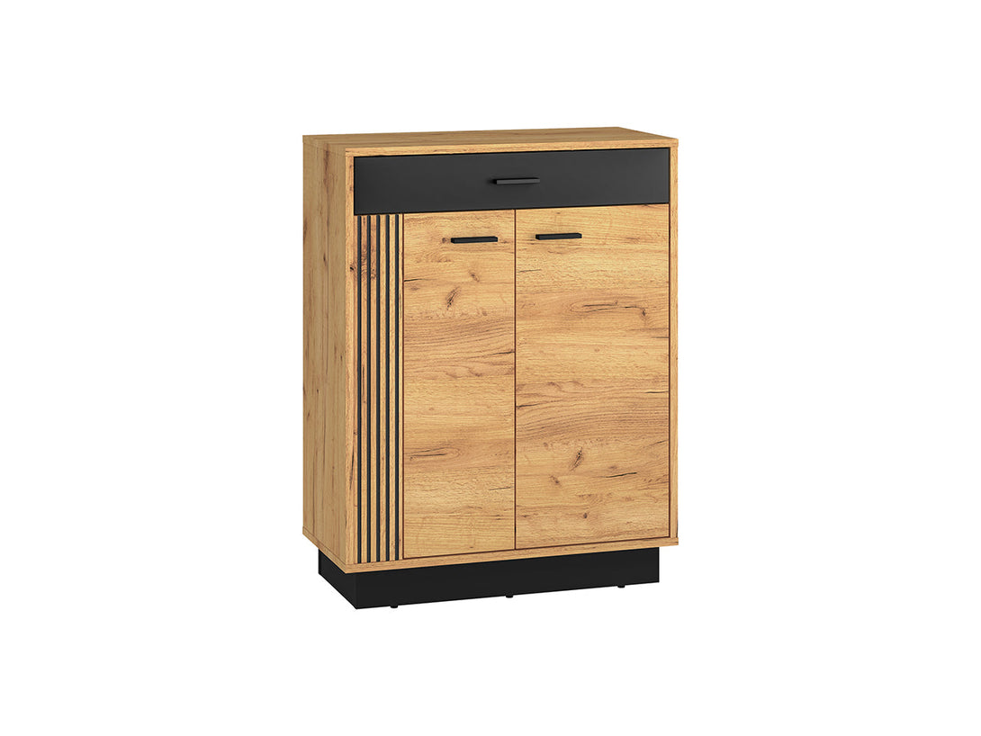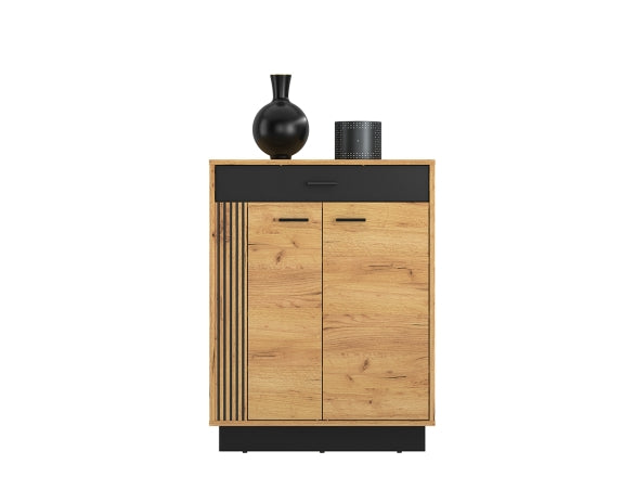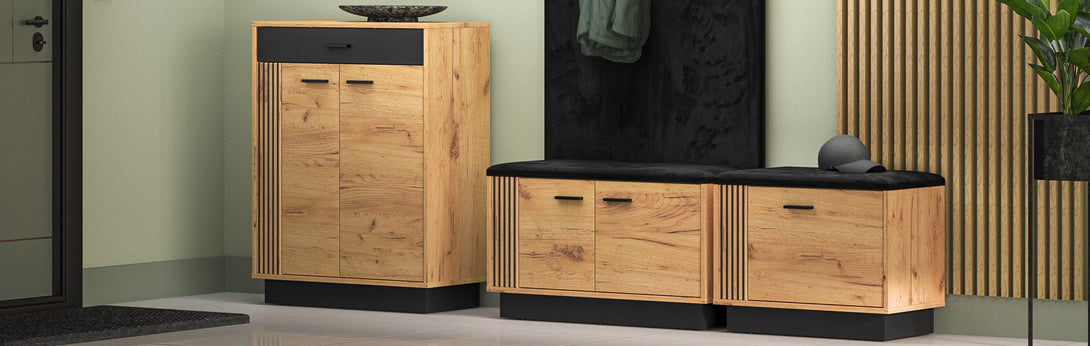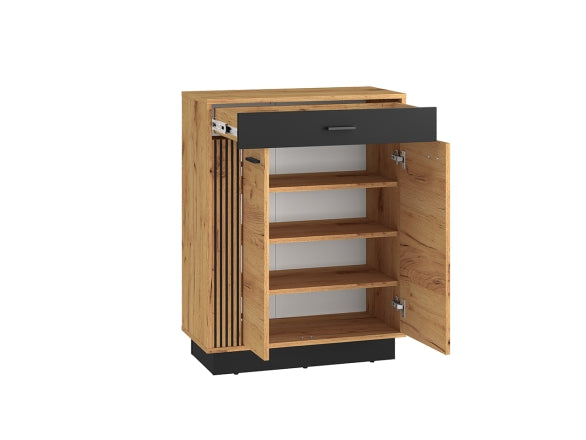 Der VASCO Schuhschrank überzeugt durch seine edle Kombination aus Gold Craft Oak Front und schwarzem Korpus. Sein schlankes Design mit laminierter Oberfläche und ABS‑Kanten verleiht jedem Flur oder Eingangsbereich eine moderne und funktionale Note. Mit den Maßen 70 cm Breite und 91 cm Höhe bietet er praktische Aufbewahrung für Schuhe und sorgt gleichzeitig für Ordnung und Stil.Dank der hochwertigen Laminatplatte ist der Schrank unempfindlich gegen Kratzer, Feuchtigkeit und Temperaturschwankungen. Der Schrank wird zerlegt in einer Originalverpackung geliefert und lässt sich unkompliziert in einem Paket montieren – ideal für den modernen Haushalt.