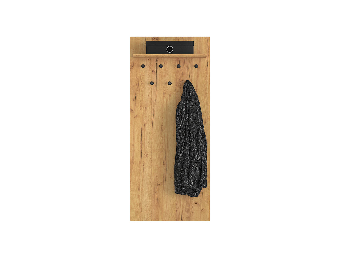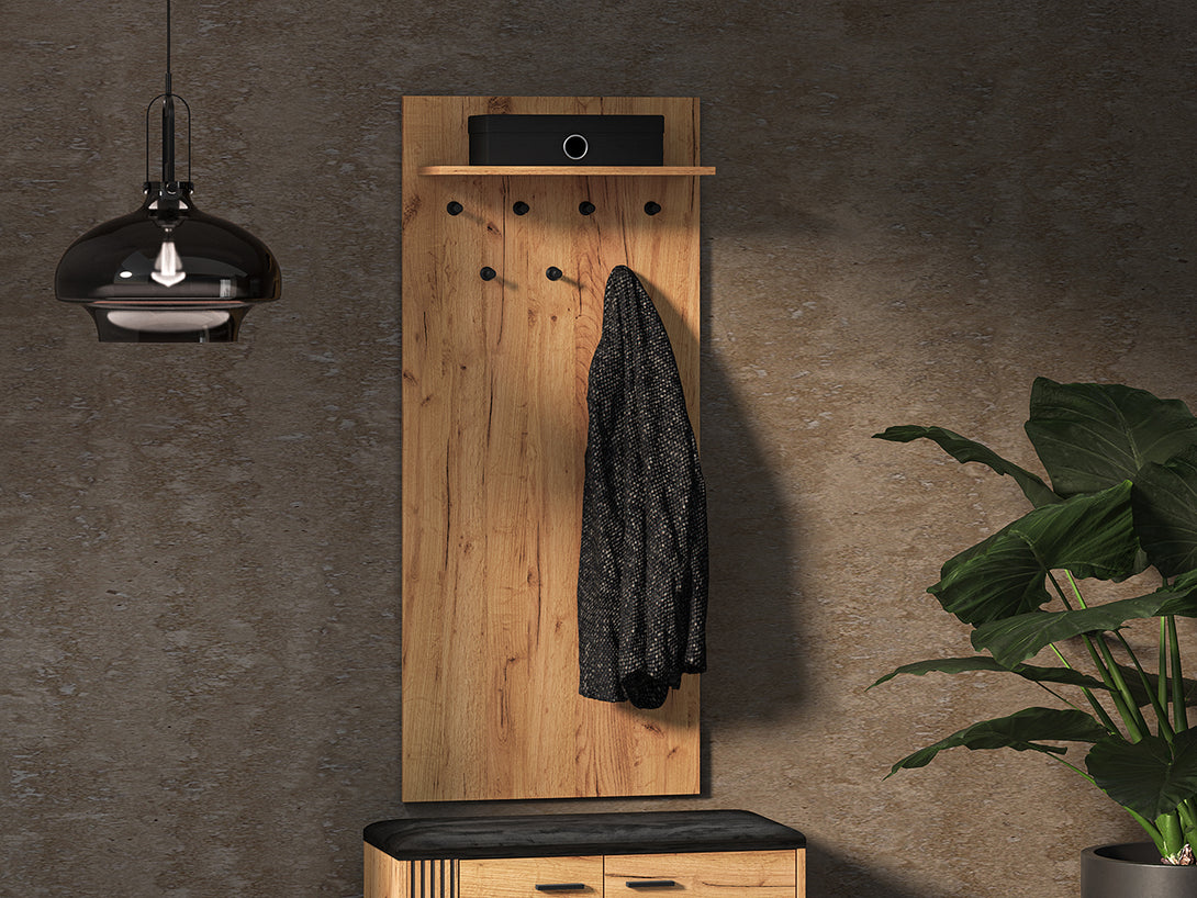 Das VASCO Garderobenpaneel besticht durch seine hochwertige Gold Craft Oak Front und dichten Laminatkorpus mit ABS-Kanten, die das Möbelstück besonders robust gegenüber Kratzern, Feuchtigkeit und hohen Temperaturen machen. Mit einer Höhe von 138 cm und einer schlanken Tiefe von 24 cm bietet es eine elegante Lösung für den Garderobenbereich, ohne dabei viel Platz einzunehmen.