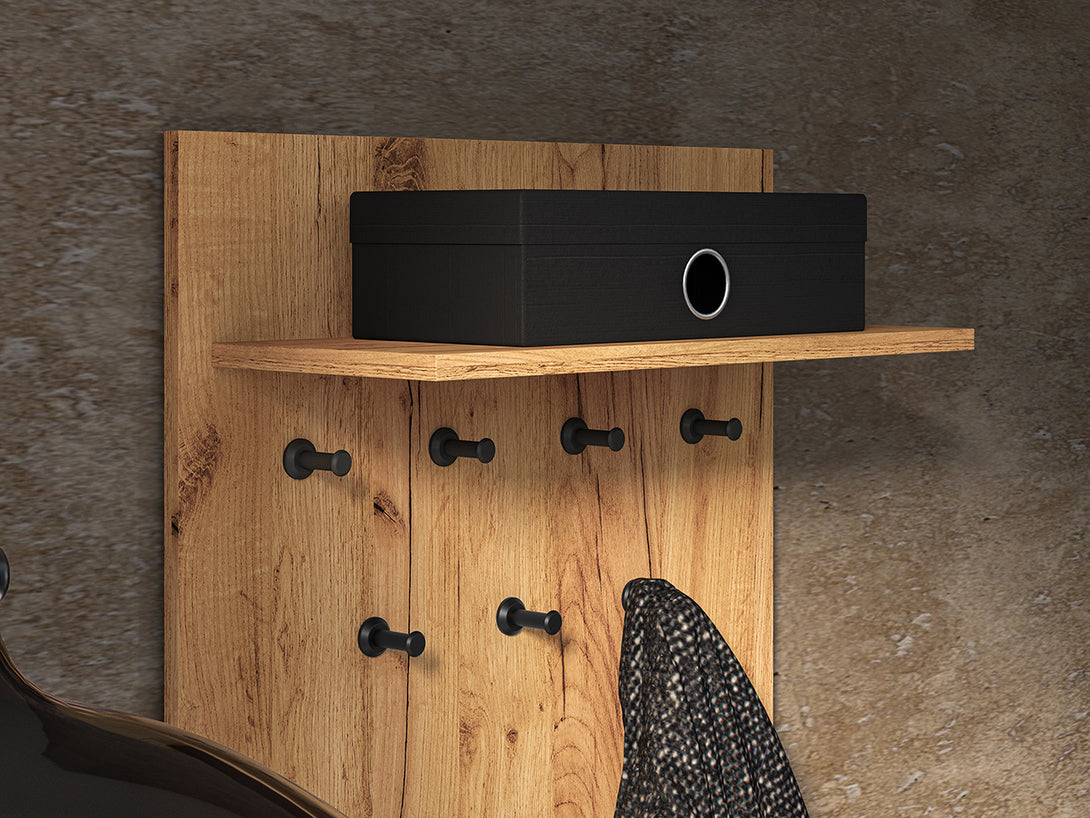 Verankert an der Wand, überzeugt das Paneel durch seine moderne Optik und funktionelle Beschaffenheit: Ästhetisch integrierte Hängemöglichkeiten sorgen für Übersichtlichkeit im Flur oder Eingangsbereich und unterstreichen gleichzeitig das zeitgemäße Design. Die Lieferung erfolgt zerlegt in der Originalverpackung und erleichtert somit den Transport und die Montage.