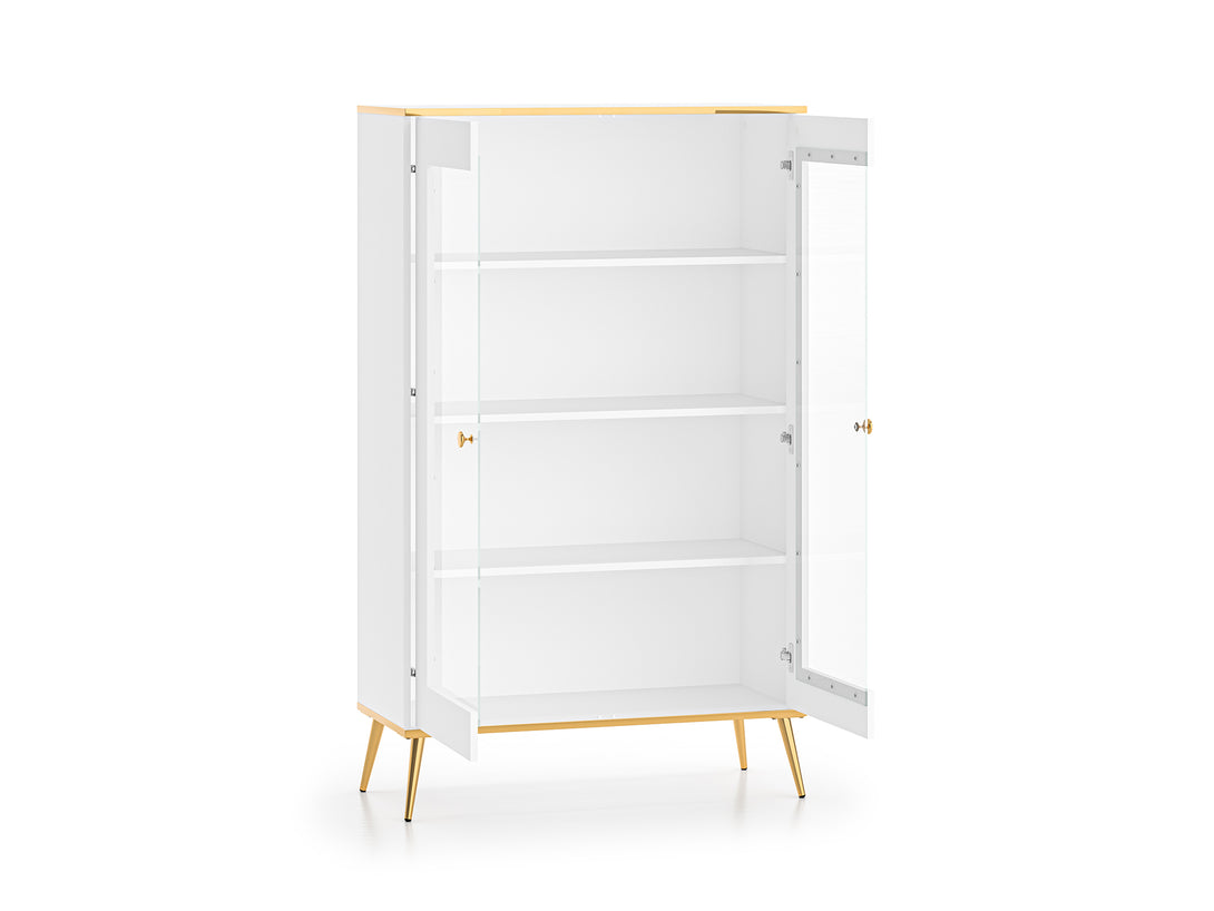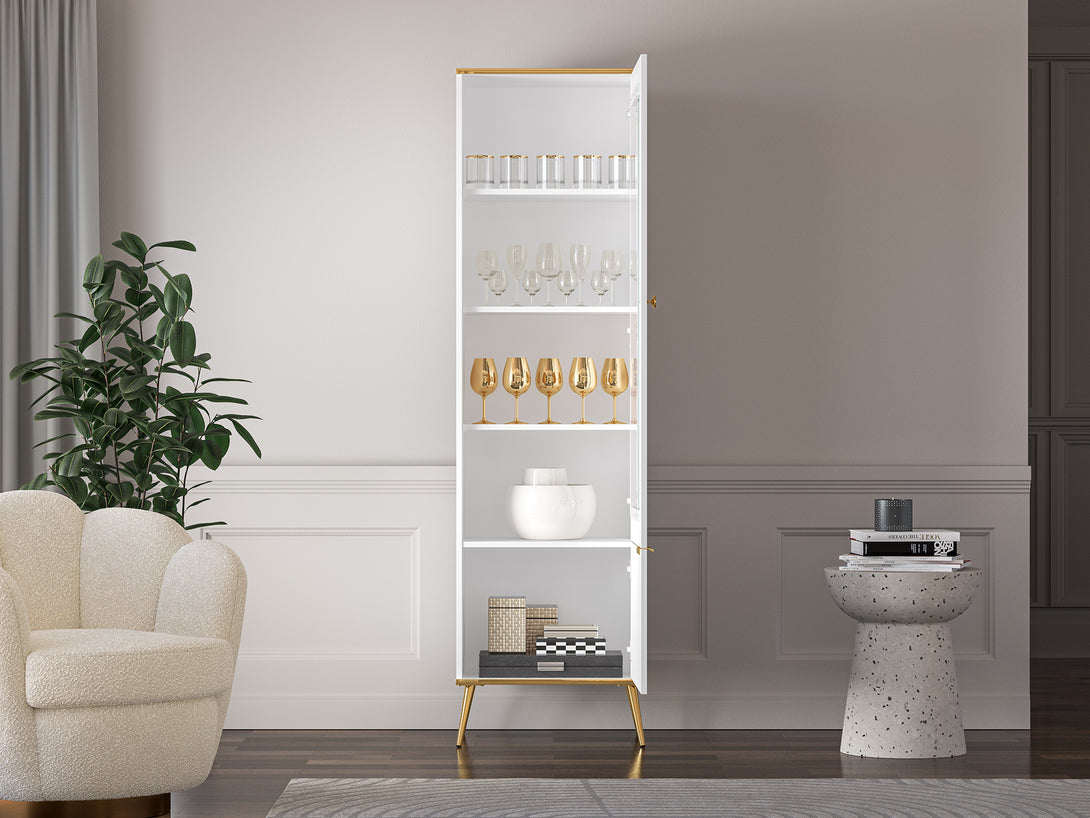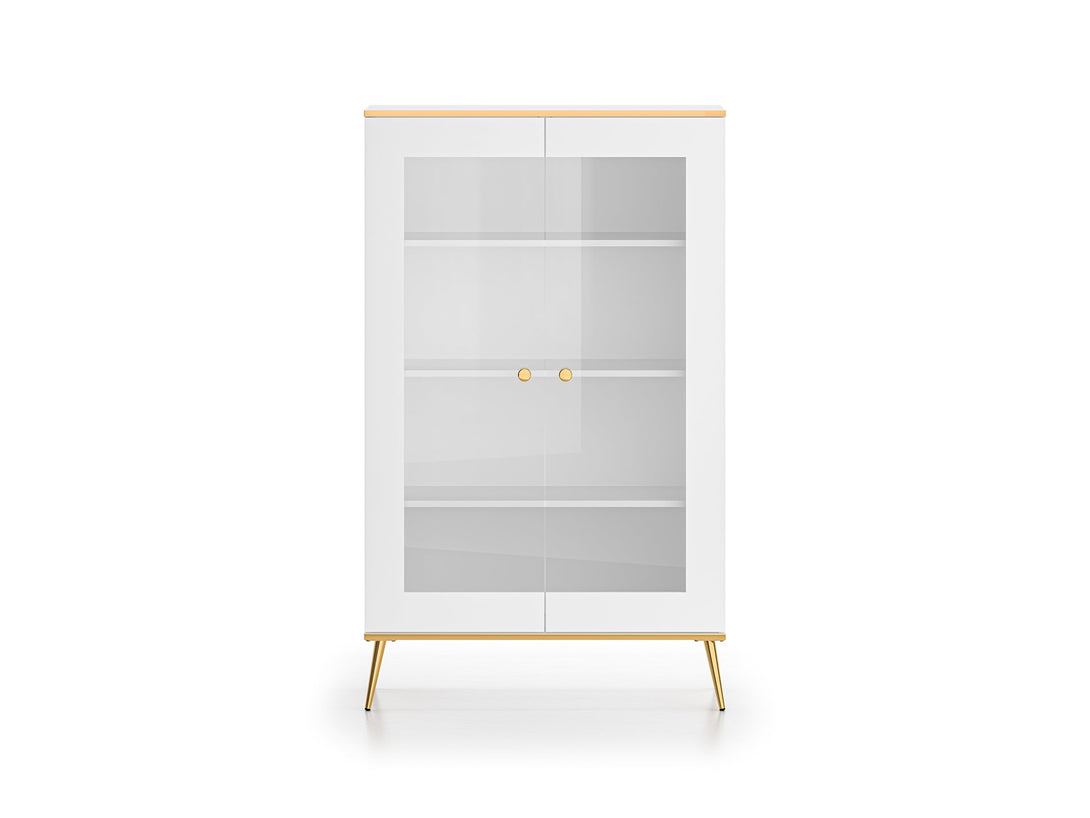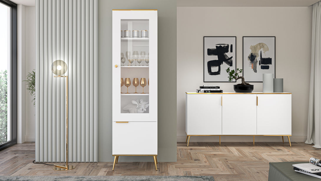 Die weiße mattierte Front und das stabile Design machen diese Vitrinen zu einem zeitlosen Möbelstück, das in jedem Raum Akzente setzt.