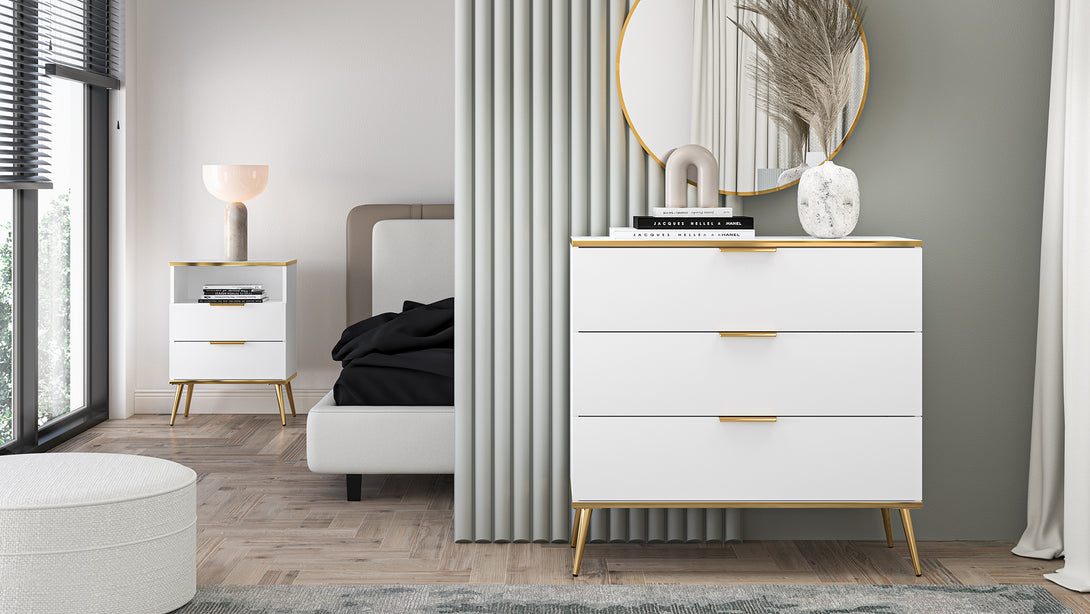 Beide Möbelstücke sind in einem eleganten Weiß gehalten und fügen sich harmonisch in jede Einrichtung ein. Hochwertige Materialien und eine durchdachte Verarbeitung sorgen für Langlebigkeit und stilvolle Optik in Ihrem Schlafzimmer.