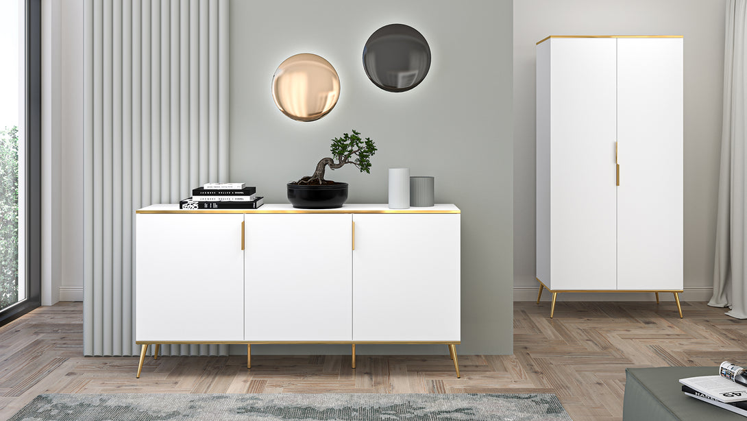 Das VITERBO Wohnzimmer-Set vereint modernes Design mit durchdachter Funktionalität. Der großzügige Kleiderschrank mit seiner hohen Form bietet jede Menge Stauraum für Kleidung oder Haushaltsgegenstände. Ergänzt wird er durch eine breite Kommode, die als TV-Board oder als zusätzlicher Stauraum im Wohnzimmer dient.